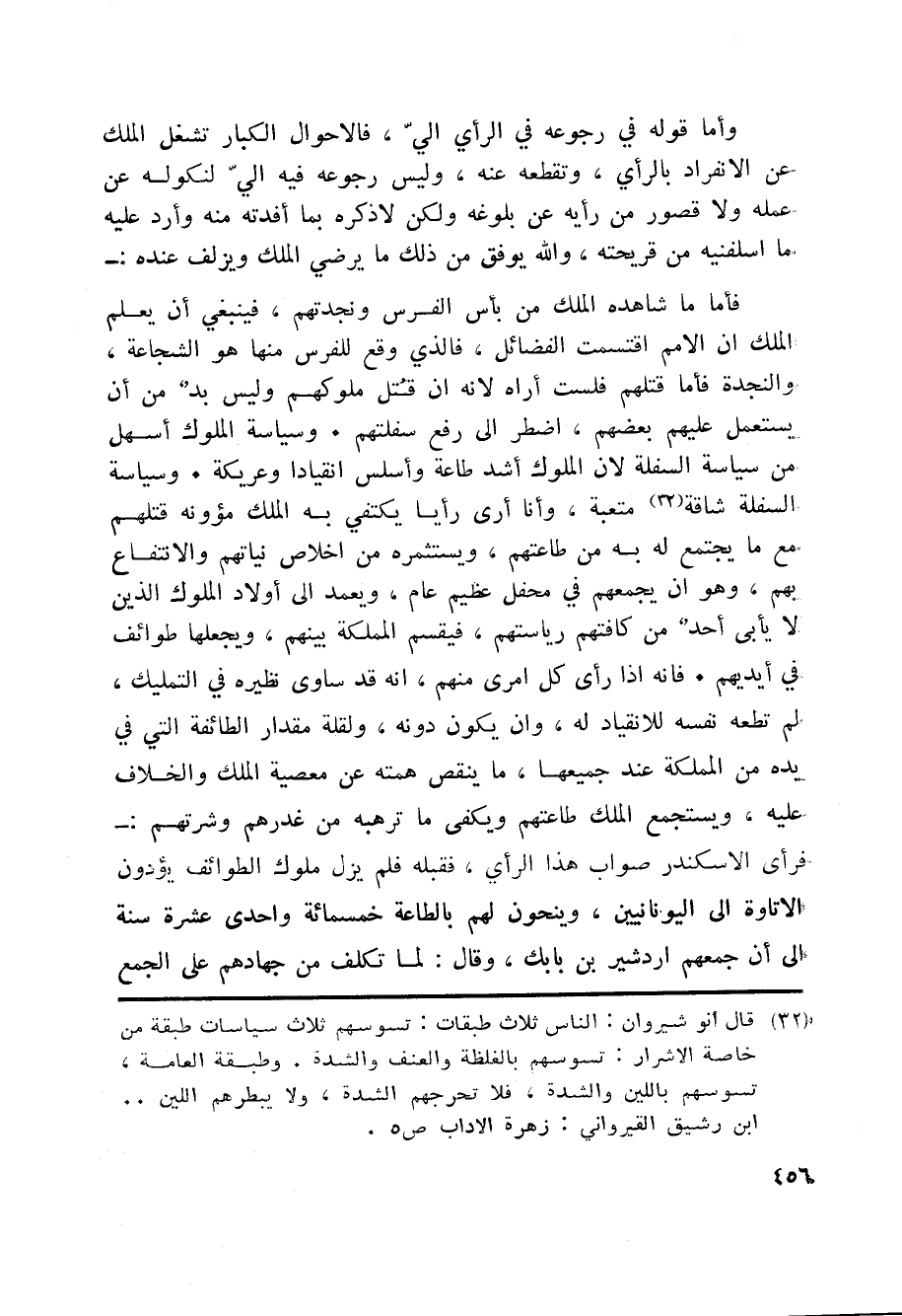 فأما ما شاهده الملك من بأس الفرس ونجدتهم، فينبغي أن يعلم الملك ان الامم اقتسمت الفضائل، فالذي وقع للفرس منها هو الشجاعة، والنجدة فأما قتلهم فلست أراه لانه ان قتل ملوكهم وليس بد من أن يستعمل عليهم بعضهم، اضطر الى رفع سفلتهم. وسياسة الملوك أسهل من سياسة السفلة لان الملوك أشد طاعة وأسلس انقيادا وعريكة. وسياسة السفلة شاقة «32» متعبة، وأنا أرى رأيا يكتفي به الملك مؤونه قتلهم مع ما يجتمع له به من طاعتهم، ويستثمره من اخلاص نياتهم والانتفاع بهم، وهو ان يجمعهم في محفل عظيم عام، ويعمد الى أولاد الملوك الذين لا يأبى أحد من كافتهم رياستهم، فيقسم المملكة بينهم، ويجعلها طوائف في أيديهم. فانه اذا رأى كل امرى منهم، انه قد ساوى نظيره في التمليك، لم تطعه نفسه للانقياد له، وان يكون دونه، ولقلة مقدار الطائفة التي في يده من المملكة عند جميعها، ما ينقص همته عن معصية الملك والخلاف عليه، ويستجمع الملك طاعتهم ويكفى ما ترهبه من غدرهم وشرتهم:- فرأى الاسكندر صواب هذا الرأي، فقبله فلم يزل ملوك الطوائف يؤدون الاتاوة الى اليونانيين، وينحون لهم بالطاعة خمسمائة واحدى عشرة سنة الى أن جمعهم اردشير بن بابك، وقال: لما تكلف من جهادهم على الجمع