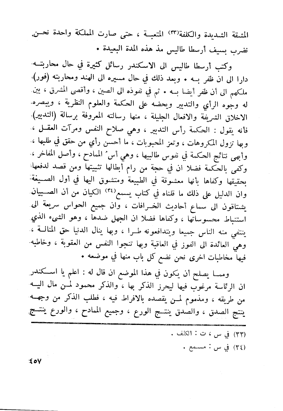 وكتب أرسطاطاليس الى الاسكندر رسائل كثيرة في حال محاربته دارا الى ان ظفر به. وبعد ذلك في حال مسيره الى الهند ومحاربته (فور) ملكهم الى أن ظفر أيضا به. ثم في نفوذه الى الصين، وأقصى المشرق، بين له وجوه الرأي والتدبير ويحضه على الحكمة والعلوم النظرية، ويبصره الاخلاق الشريفة والافعال الجليلة، منها رسالته المعروفة برسالة (التدبير) فأنه يقول: الحكمة رأس التدبير، وهي صلاح النفس ومرآت العقل، وبها تزول المكروهات، وتعز المحبوبات، ما أحسن رأي من حقق في طلبها، وأبهى نتائج الحكمة في نفوس طالبيها، وهي أس الممادح، وأصل المفاخر، وكفى بالحكمة فضلا ان في حجة من رام أبطالها تثبيتها ومن قصد لدفعها بحقيقها وكفاها بأنها معشوقة في الطبيعة ومتشوق اليها في أول الصيغة وان الدليل على ذلك ما قلناه في كتاب يسمع «34» الكيان من أن الصبيان يشتاقون الى سماع أحاديث الخرافات، وان جميع الحواس سريعة الى استنباط محسوساتها، وكفاها فضلا ان الجهل ضدها، وهو الشيء الذي ينتفي منه الناس جميعا ويتدافعونه طرا، وبها ينال الدنيا حق المنالة، وهي العائدة الى الفوز في العاقبة وبها تنجوا النفس من العقوبة، وخاطبه فيها مخاطبات اخرى نحن نضع كل باب منها في موضعه.