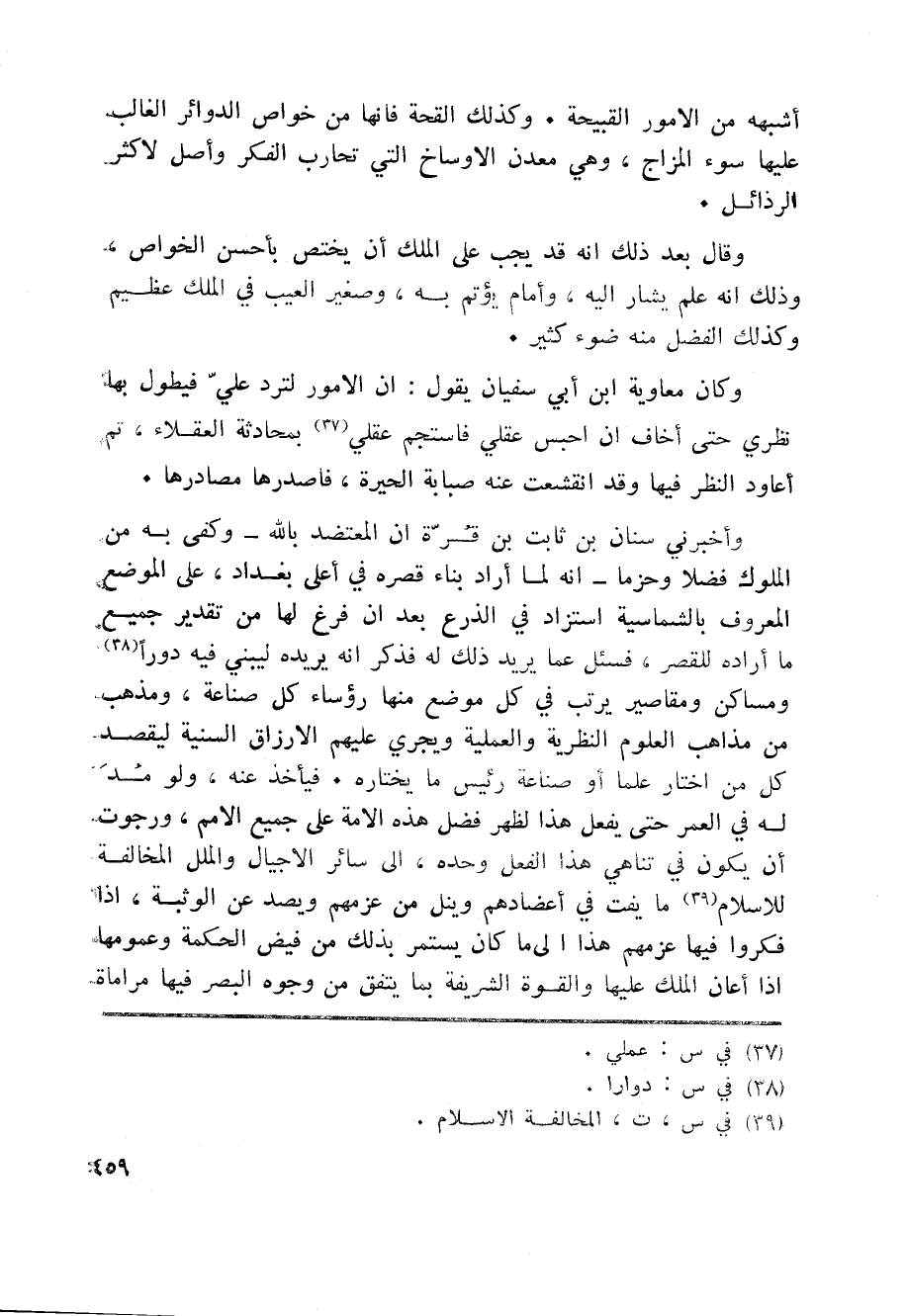 وأخبرني سنان بن ثابت بن قرّة ان المعتضد بالله- وكفى به من الملوك فضلا وحزما- انه لما أراد بناء قصره في أعلى بغداد، على الموضع المعروف بالشماسية استزاد في الذرع بعد ان فرغ لها من تقدير جميع ما أراده للقصر، فسئل عما يريد ذلك له فذكر انه يريده ليبني فيه دورا «38» ومساكن ومقاصير يرتب في كل موضع منها رؤساء كل صناعة، ومذهب من مذاهب العلوم النظرية والعملية ويجري عليهم الارزاق السنية ليقصد كل من اختار علما أو صناعة رئيس ما يختاره. فيأخذ عنه، ولو مد له في العمر حتى يفعل هذا لظهر فضل هذه الامة على جميع الامم، ورجوت أن يكون في تناهي هذا الفعل وحده، الى سائر الاجيال والملل المخالفة للاسلام «39» ما يفت في أعضادهم وينل من عزمهم ويصد عن الوثبة، اذا فكروا فيها عزمهم هذا الى ما كان يستمر بذلك من فيض الحكمة وعمومها اذا أعان الملك عليها والقوة الشريفة بما يتفق من وجوه البصر فيها مراماة
