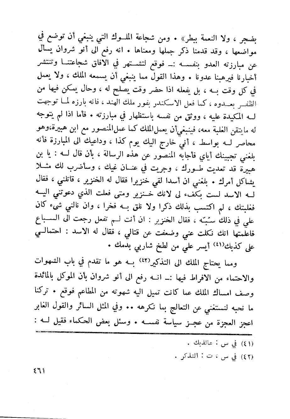 بضجر، ولا النعمة ببطر» . ومن شجاعة الملوك التي ينبغي أن توضع في مواضعها، وقد قدمنا ذكر جملها ومعناها. انه رفع الى أنو شروان يسأل عن مبارزته العدو بنفسه:- فوقع لتشتهر في الافاق شجاعتنا وتنتشر أخبارنا فيرهبنا عدونا. وهذا القول مما ينبغي أن يسمعه الملك، ولا يعمل في كل وقت به، بل يفعله اذا حضر وقت يصلح له، وحال يمكن فيها من الظفر بعدوه، كما فعل الاسكندر بفور ملك الهند، فانه بارزه لما توجهت له المكيدة عليه، ووثق من نفسه باستظهار في مبارزته. فأما اذا لم يتوجه له ما يتقن الغلبة معه، فينبغي أن يعمل الملك كما عمل المنصور مع ابن هبيرة، وهو محاصر له بواسط، أني خارج اليك يوم كذا، وداعيك الى المبارزة فأنه بلغني تجبينك إياي فأجابه المنصور عن هذه الرسالة، بأن قال له: يا بن هبيرة قد تعديت طورك، وجريت في عنان غيك، وسأضرب لك مثلا يشاكل أمرك. بلغني ان أسدا لقي خنزيرا فقال له الخنزير، قاتلني، فقال له الاسد لست بكفء لى لانك خنزير ومتى فعلت الذي دعوتني اليه فغلبتك، لم اكتسب بذلك ذكرا ولا نلق به فخرا، وان نالني شيء كان علي في ذلك سبّه، فقال الخنزير: ان أنت لم تفعل رجعت الى السباع فاعلمتها انك نكلت عني وضعفت عن قتالي، فقال له الاسد: احتمالي على كذبك «41» أيسر علي من لطخ شاربي بدمك.