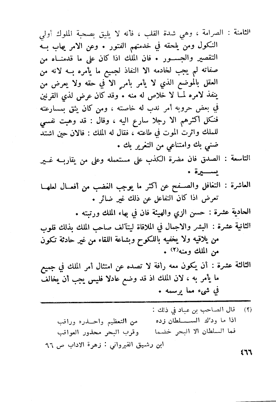 الثامنة: الصرامة، وهي شدة القلب، فأنه لا يليق بصحبة الملوك أولي النكول ومن يلحقه في خدمتهم الفتور. وعن الامر يهاب به التقصير والجسور. فان الملك اذا كان على ما قدمناه من صفاته لم يجب لخادمه الا النفاذ لجميع ما يأمره به لانه من العقل بالموضع الذي لا يأمر بأمر الا في حقه ولا يعرض من ينفذ لامره لما لا خلاص له منه. وقد كان عرض لذي القرنين في بعض حروبه أمر ندب له خاصته، ومن كان يثق بمسارعته فنكل أكثرهم الا رجلا سارع اليه، وقال: قد وهبت نفسي للملك واثرت الموت في طاعته، فقال له الملك: فالان حين اشتد ضني بك وامتناعي من التغرير بك.