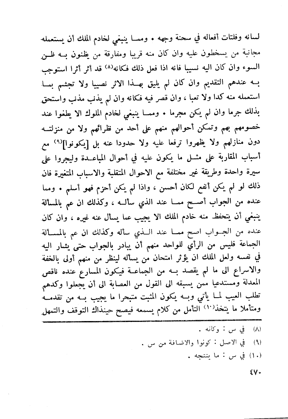لسانه وفلتات أفعاله في سحنة وجهه. ومما ينبغي لخادم الملك أن يستعمله مجانبة من يسخطون عليه وان كان منه قريبا ومفارقة من يظنون به ظن السوء وان كان اليه نسيبا فانه اذا فعل ذلك فكانه «8» قد أثر أثرا استوجب به عندهم التقديم وان كان لم يليق بهذا الاثر نصيبا ولا تجشم بما استعمله منه كدا ولا تعبا، وان قصر فيه فكانه وان لم يذنب مذنب واستحق بذلك جرما وان لم يكن مجرما. ومما ينبغي لخادم الملوك الا يطغوا عند خصومهم بهم وتمكن أحوالهم منهم على أحد من نظرائهم ولا من منزلته دون منازلهم ولا يظهروا ترفعا عليه ولا حدودا عنه بل [يكونوا] «9» مع أسباب المقاربة على مثل ما يكون عليه في أحوال المباعدة وليجروا على سيرة واحدة وطريقة غير مختلفة مع الاحوال المتقلبة والاسباب المتغيرة فان ذلك لو لم يكن أنفع لكان أحسن، واذا لم يكن أحزم فهو أسلم. ومما عنده من الجواب أصح مما عند الذي سأله، وكذلك ان عم بالمسألة ينبغي أن يتحفظ منه خادم الملك الا يجيب عما يسأل عنه غيره، وان كان عنده من الجواب اصح مما عند الذي سأله وكذلك ان عم بالمسألة الجماعة فليس من الرأي للواحد منهم أن يبادر بالجواب حتى يشار اليه في نفسه ولعل الملك ان يؤثر امتحان من يسأله لينظر من منهم أولى بالخفة والاسراع الى ما لم يقصد به من الجماعة فيكون المسارع عنده ناقص المعدلة ومستدعيا ممن يسبقه الى القول من العصابة الى أن يجعلوا وكدهم تطلب العيب لما يأتي وبه يكون المثبت متبحرا ما يجيب به من تقدمه ومتأملا ما يتخذ «10» التأمل من كلام يسمعه فيصح حينذاك التوقف والتمهل