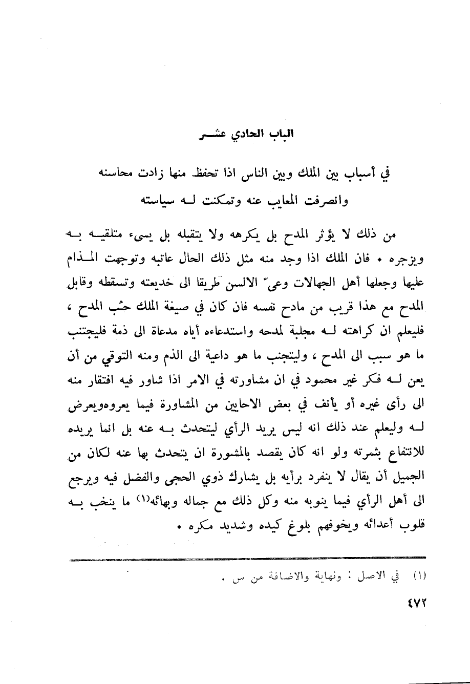 الباب الحادي عشر في أسباب بين الملك وبين الناس اذا تحفظ منها زادت محاسنه وانصرفت المعايب عنه وتمكنت له سياسته