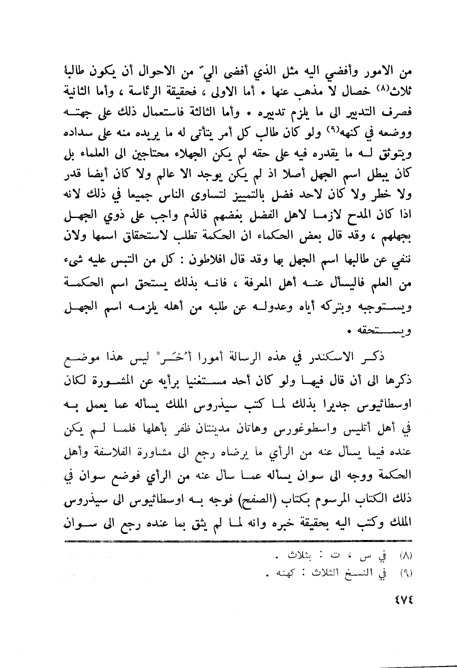 من الامور وأفضي اليه مثل الذي أفضى اليّ من الاحوال أن يكون طالبا ثلاث «8» خصال لا مذهب عنها. أما الاولى، فحقيقة الرئاسة، وأما الثانية فصرف التدبير الى ما يلزم تدبيره. وأما الثالثة فاستعمال ذلك على جهته ووضعه في كنهه «9» ولو كان طالب كل أمر يتأتى له ما يريده منه على سداده ويتوثق له ما يقدره فيه على حقه لم يكن الجهلاء محتاجين الى العلماء بل كان يبطل اسم الجهل أصلا اذ لم يكن يوجد الا عالم ولا كان أيضا قدر ولا خطر ولا كان لاحد فضل بالتمييز لتساوى الناس جميعا في ذلك لانه اذا كان المدح لازما لاهل الفضل بغضهم فالذم واجب على ذوي الجهل بجهلهم، وقد قال بعض الحكماء ان الحكمة تطلب لاستحقاق اسمها ولان ننفي عن طالبها اسم الجهل بها وقد قال افلاطون: كل من التبس عليه شيء من العلم فليسأل عنه أهل المعرفة، فانه بذلك يستحق اسم الحكمة ويستوجبه وبتركه أياه وعدوله عن طلبه من أهله يلزمه اسم الجهل ويستحقه.