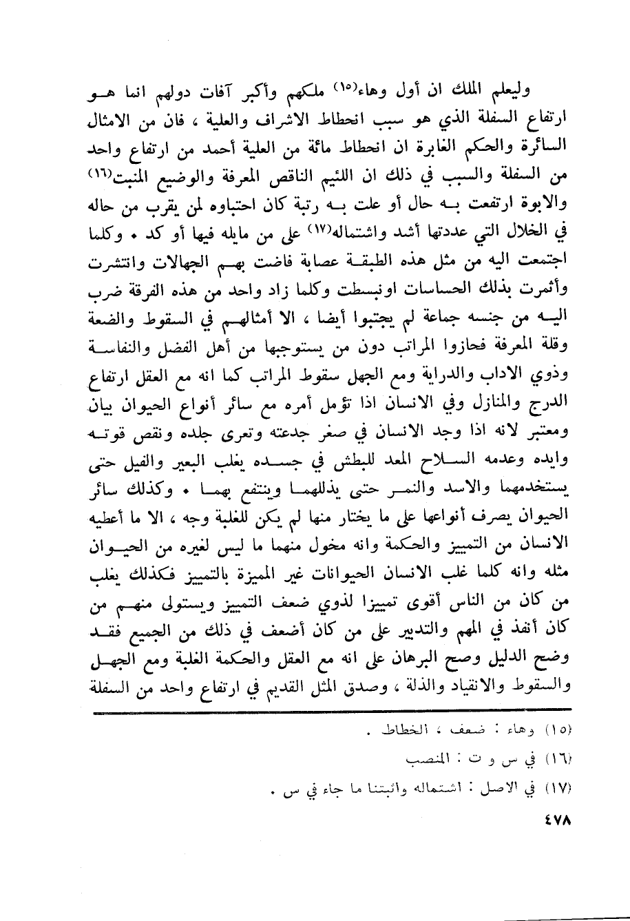 وليعلم الملك ان أول وهاء «15» ملكهم وأكبر آفات دولهم انما هو ارتفاع السفلة الذي هو سبب انحطاط الاشراف والعلية، فان من الامثال السائرة والحكم الغابرة ان انحطاط مائة من العلية أحمد من ارتفاع واحد من السفلة والسبب في ذلك ان اللئيم الناقص المعرفة والوضيع المنبت «16» والابوة ارتفعت به حال أو علت به رتبة كان احتباؤه لمن يقرب من حاله في الخلال التي عددتها أشد واشتماله «17» على من مايله فيها أو كد. وكلما اجتمعت اليه من مثل هذه الطبقة عصابة فاضت بهم الجهالات وانتشرت وأثمرت بذلك الحساسات او نبسطت وكلما زاد واحد من هذه الفرقة ضرب اليه من جنسه جماعة لم يجتبوا أيضا، الا أمثالهم في السقوط والضعة وقلة المعرفة فحازوا المراتب دون من يستوجبها من أهل الفضل والنفاسة وذوي الآداب والدراية ومع الجهل سقوط المراتب كما انه مع العقل ارتفاع الدرج والمنازل وفي الانسان اذا تؤمل أمره مع سائر أنواع الحيوان بيان ومعتبر لانه اذا وجد الانسان في صغر جدعته وتعرى جلده ونقص قوته وايده وعدمه السلاح المعد للبطش في جسده يغلب البعير والفيل حتى يستخدمهما والاسد والنمر حتى يذللهما وينتفع بهما. وكذلك سائر الحيوان يصرف أنواعها على ما يختار منها لم يكن للغلبة وجه، الا ما أعطيه الانسان من التمييز والحكمة وانه مخول منهما ما ليس لغيره من الحيوان مثله وانه كلما غلب الانسان الحيوانات غير المميزة بالتمييز فكذلك يغلب من كان من الناس أقوى تمييزا لذوي ضعف التمييز ويستولى منهم من كان أنفذ في المهم والتدبير على من كان أضعف في ذلك من الجميع فقد وضح الدليل وصح البرهان على انه مع العقل والحكمة الغلبة ومع الجهل والسقوط والانقياد والذلة، وصدق المثل القديم في ارتفاع واحد من السفلة