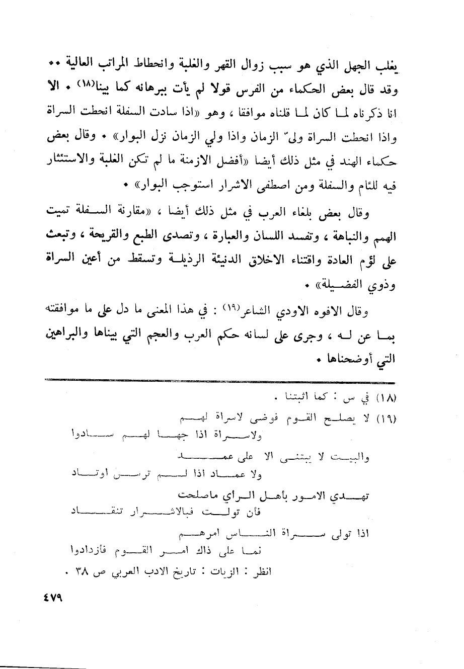 وقد قال بعض الحكماء من الفرس قولا لم يأت ببرهانه كما بينا «18» . الا انا ذكرناه لما كان لما قلناه موافقا، وهو «اذا سادت السفلة انحطت السراة واذا انحطت السراة ولىّ الزمان واذا ولي الزمان نزل البوار» . وقال بعض حكماء الهند في مثل ذلك أيضا «أفضل الازمنة ما لم تكن الغلبة والاستئثار فيه للئام والسفلة ومن اصطفى الاشرار استوجب البوار» .