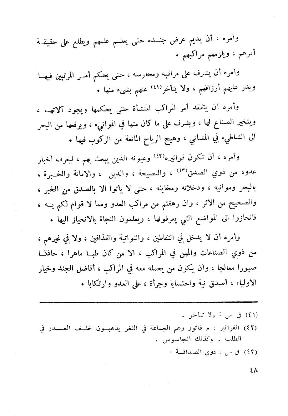 وأمره أن لا يدخل في النفاطين، والنواتية والقذافين، ولا في غيرهم، من ذوي الصناعات والمهن في المراكب، الا من كان طبا ماهرا، حاذقا صبورا معالجا، وأن يكون من يحمله معه في المراكب، أفاضل الجند وخيار الاولياء، أصدق نية واحتسابا وجرأة، على العدو وارتكابا.