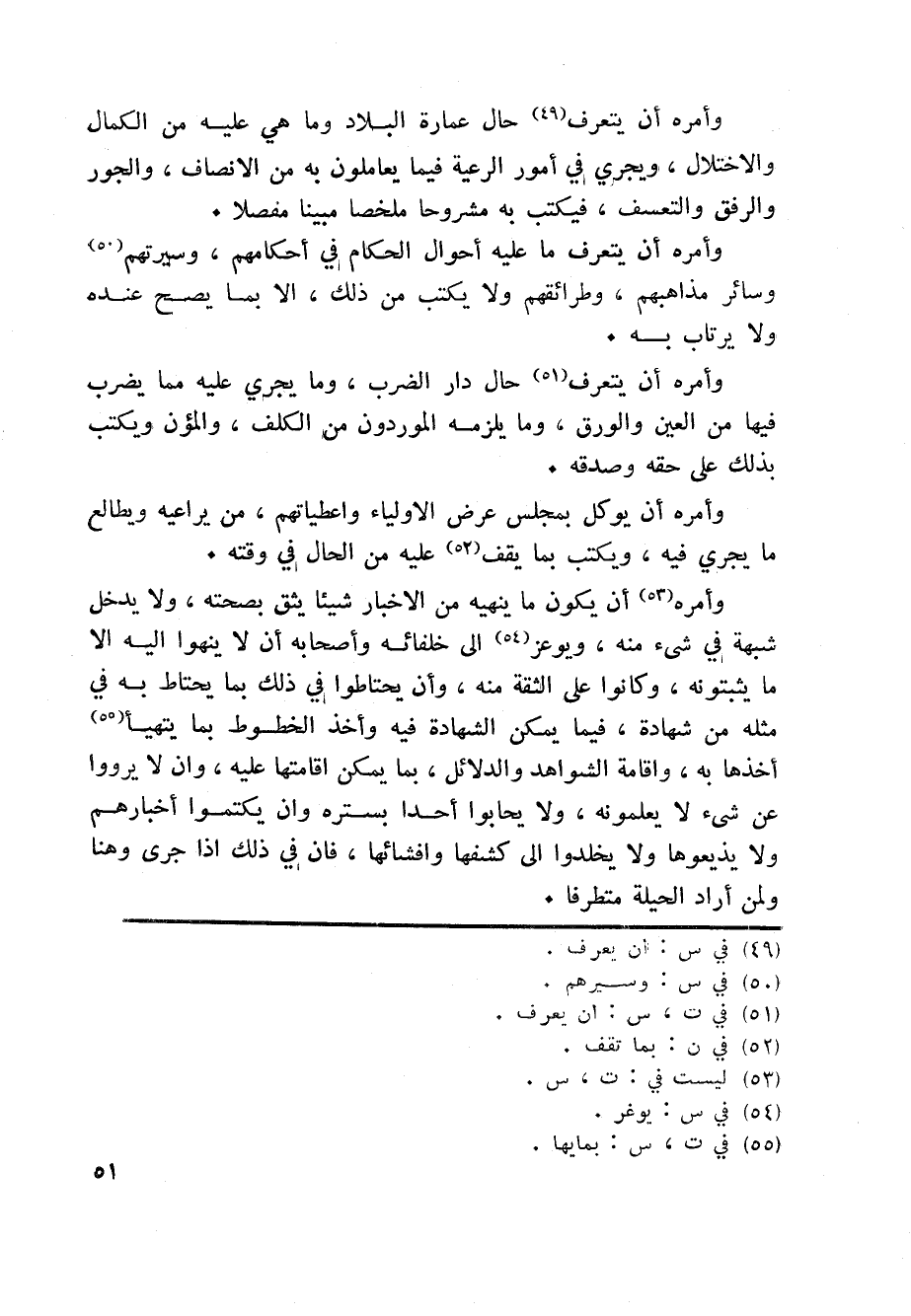 وأمره «53» أن يكون ما ينهيه من الاخبار شيئا يثق بصحته، ولا يدخل شبهة في شيء منه، ويوعز «54» الى خلفائه وأصحابه أن لا ينهوا اليه الا ما يثبتونه، وكانوا على الثقة منه، وأن يحتاطوا في ذلك بما يحتاط به في مثله من شهادة، فيما يمكن الشهادة فيه وأخذ الخطوط بما يتهيأ «55» أخذها به، واقامة الشواهد والدلائل، بما يمكن اقامتها عليه، وان لا يرووا عن شيء لا يعلمونه، ولا يحابوا أحدا بستره وان يكتموا أخبارهم ولا يذيعوها ولا يخلدوا الى كشفها وافشائها، فان في ذلك اذا جرى وهنا ولمن أراد الحيلة متطرفا.