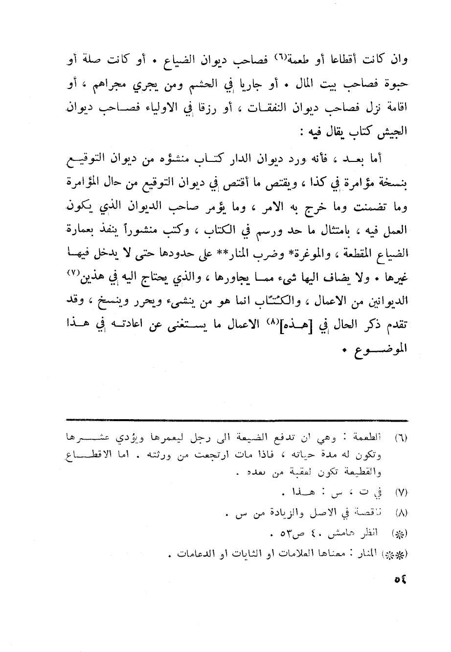أما بعد، فأنه ورد ديوان الدار كتاب منشؤه من ديوان التوقيع بنسخة مؤامرة في كذا، ويقتص ما أقتص في ديوان التوقيع من حال المؤامرة وما تضمنت وما خرج به الامر، وما يؤمر صاحب الديوان الذي يكون العمل فيه، بامتثال ما حد ورسم في الكتاب، وكتب منشورا ينفذ بعمارة الضياع المقطعة، والموغرة «7» وضرب المنار «8» على حدودها حتى لا يدخل فيها غيرها. ولا يضاف اليها شيء مما يجاورها، والذي يحتاج اليه في هذين «9» الديوانين من الاعمال، والكتّاب انما هو من ينشئ ويحرر وينسخ، وقد تقدم ذكر الحال في [هذه] «10» الاعمال ما يستغنى عن اعادته في هذا الموضوع.