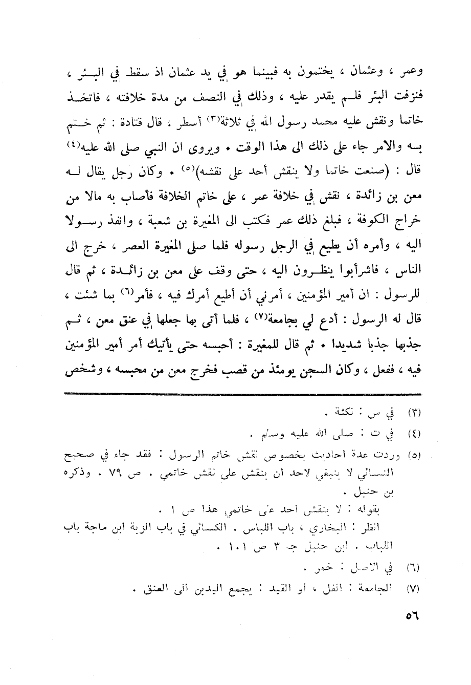 وعمر، وعثمان، يختمون به فبينما هو في يد عثمان اذ سقط في البئر، فنزفت البئر فلم يقدر عليه، وذلك في النصف من مدة خلافته، فاتخذ خاتما ونقش عليه محمد رسول الله في ثلاثة «3» أسطر، قال قتادة: ثم ختم به والامر جاء على ذلك الى هذا الوقت. ويروى ان النبي صلى الله عليه «4» قال: (صنعت خاتما ولا ينقش أحد على نقشه) «5» . وكان رجل يقال له معن بن زائدة، نقش في خلافة عمر، على خاتم الخلافة فأصاب به مالا من خراج الكوفة، فبلغ ذلك عمر فكتب الى المغيرة بن شعبة، وانفذ رسولا اليه، وأمره أن يطيع في الرجل رسوله فلما صلى المغيرة العصر، خرج الى الناس، فاشرأبوا ينظرون اليه، حتى وقف على معن بن زائدة، ثم قال للرسول: ان أمير المؤمنين، أمرني أن أطيع أمرك فيه، فأمر «6» بما شئت، قال له الرسول: أدع لي بجامعة «7» ، فلما أتى بها جعلها في عنق معن، ثم جذبها جذبا شديدا. ثم قال للمغيرة: أحبسه حتى يأتيك أمر أمير المؤمنين فيه، ففعل، وكان السجن يومئذ من قصب فخرج معن من محبسه، وشخص