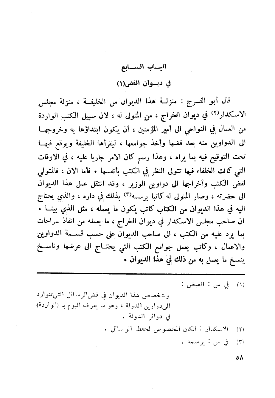 قال أبو الفرج: منزلة هذا الديوان من الخليفة، منزلة مجلس الاسكدار «2» في ديوان الخراج، من المتولى له، لان سبيل الكتب الواردة من العمال في النواحي الى أمير المؤمنين، أن يكون ابتداؤها به وخروجها الى الدواوين منه بعد فضها وأخذ جوامعها، ليقرأها الخليفة ويوقع فيها تحت التوقيع فيه بما يراه، وهذا رسم كان الامر جاريا عليه، في الاوقات التي كانت الخلفاء فيها تتولى النظر في الكتب بأنفسها. فأما الان، فالمتولي لفض الكتب وأخراجها الى دواوين الوزير، وقد انتقل عمل هذا الديوان الى حضرته، وصار المتولى له كاتبا برسمه «3» بذلك في داره، والذي يحتاج اليه في هذا الديوان من الكتاب كاتب يكون ما يعمله، مثل الذي بينا.