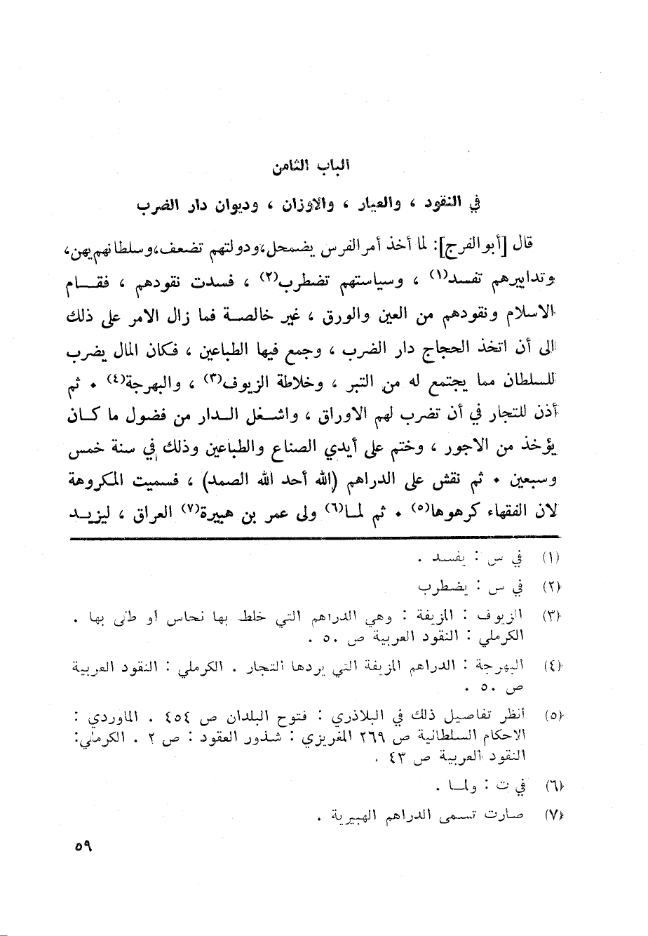 الباب الثامن في النقود، والعيار، والاوزان، وديوان دار الضرب