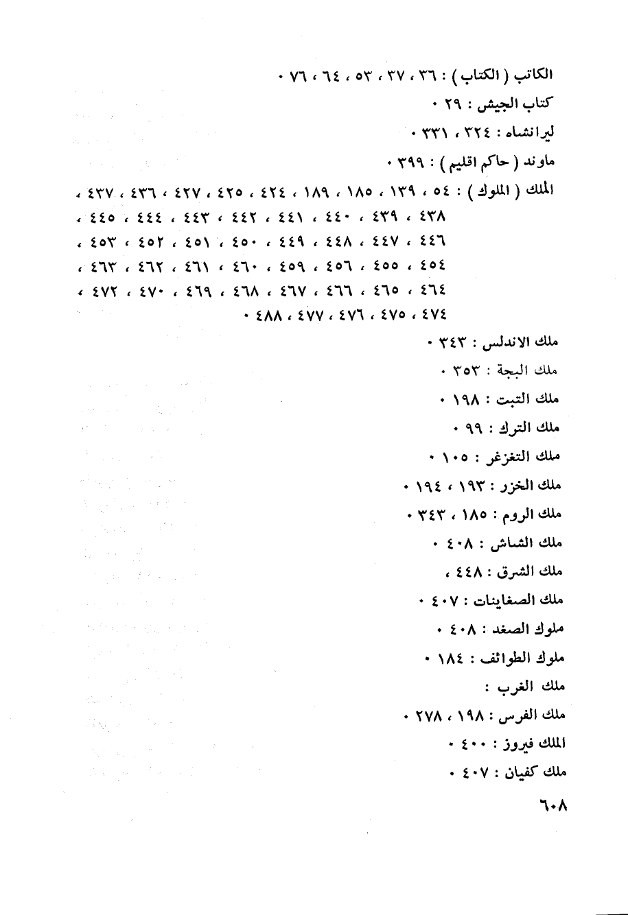 الملك (الملوك) : 54، 139، 185، 189، 424، 425، 427، 436، 437، 438، 439، 440، 441، 442، 443، 444، 445، 446، 447، 448، 449، 450، 451، 452، 453، 454، 455، 456، 459، 460، 461، 462، 463، 464، 465، 466، 467، 468، 469، 470، 472، 474، 475، 476، 477، 488.