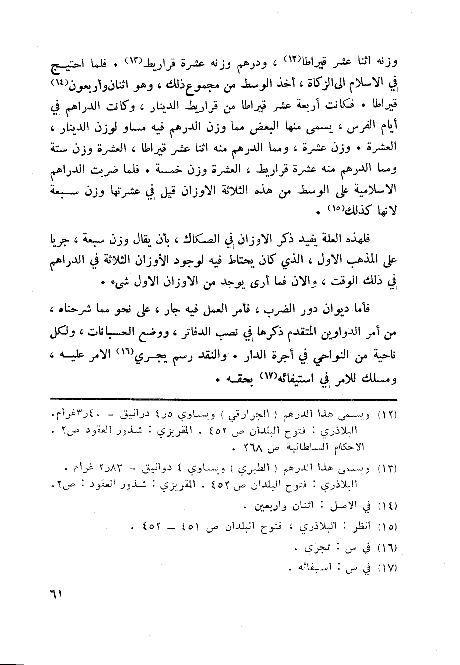 وزنه اثنا عشر قيراطا «12» ، ودرهم وزنه عشرة قراريط «13» . فلما احتيج في الاسلام الى الزكاة، أخذ الوسط من مجموع ذلك، وهو اثنان وأربعون «14» قيراطا. فكانت أربعة عشر قيراطا من قراريط الدينار، وكانت الدراهم في أيام الفرس، يسمى منها البعض مما وزن الدرهم فيه مساو لوزن الدينار، العشرة. وزن عشرة، ومما الدرهم منه اثنا عشر قيراطا، العشرة وزن ستة ومما الدرهم منه عشرة قراريط، العشرة وزن خمسة. فلما ضربت الدراهم الاسلامية على الوسط من هذه الثلاثة الاوزان قيل في عشرتها وزن سبعة لانها كذلك «15» .