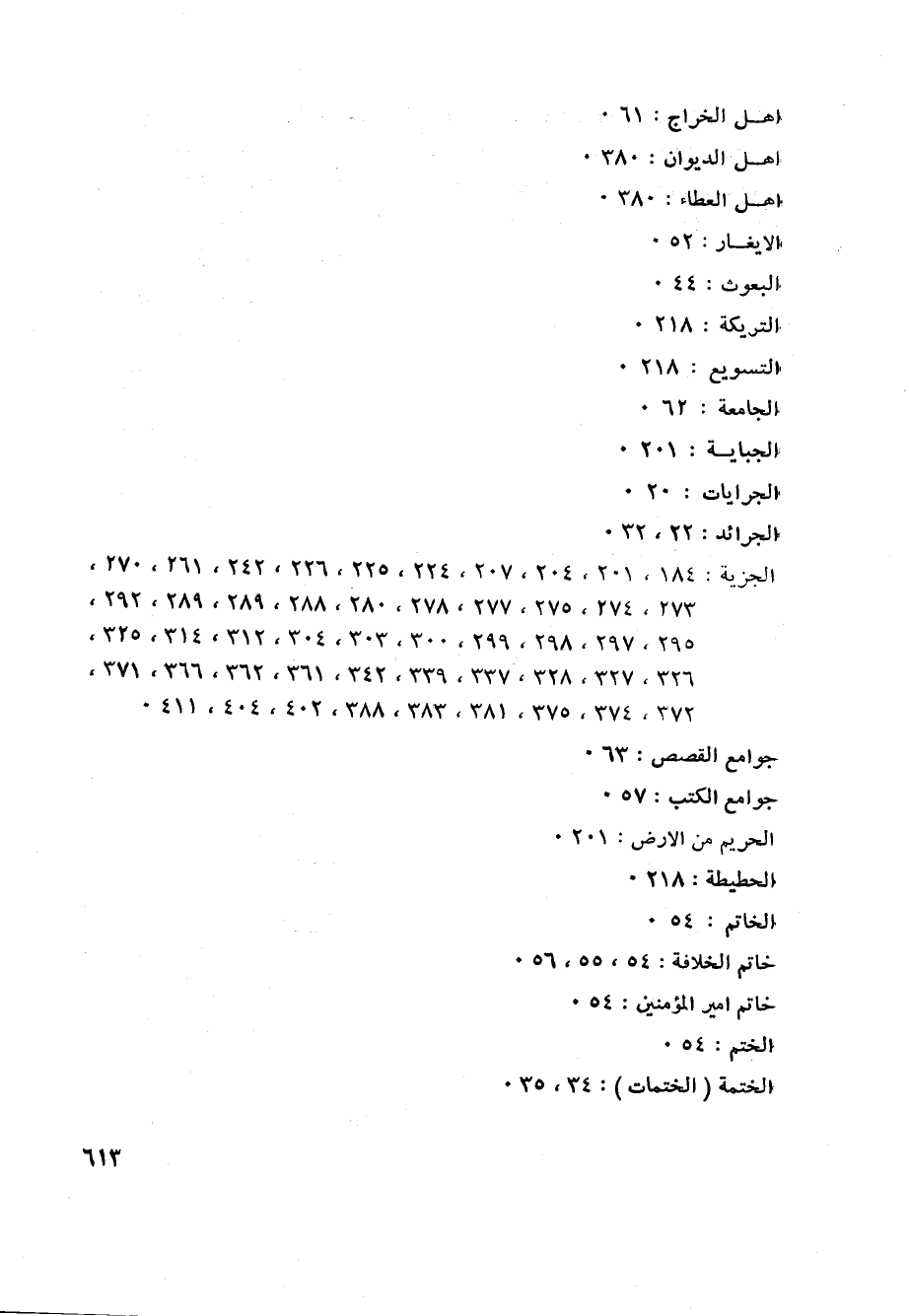 الجزية: 184، 201، 204، 207، 224، 225، 226، 242، 261، 270، 273، 274، 275، 277، 278، 280، 288، 289، 289، 292، 295، 297، 298، 299، 300، 303، 304، 312، 314، 325، 326، 327، 328، 337، 339، 342، 361، 362، 366، 371، 372، 374، 375، 381، 383، 388، 402، 404، 411.
