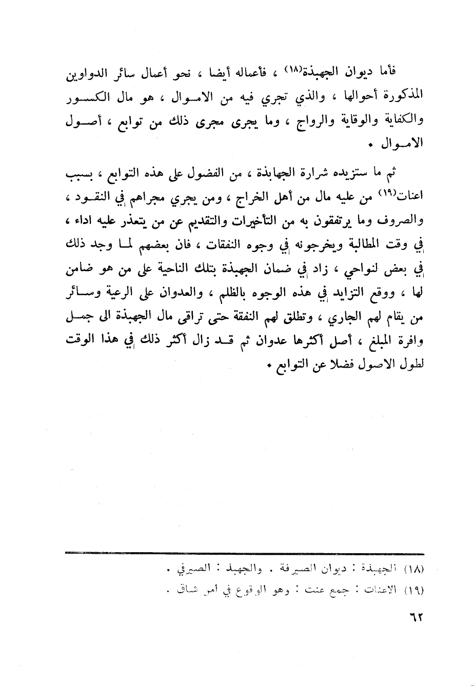 ثم ما ستزيده شرارة الجهابذة، من الفضول على هذه التوابع، بسبب اعنات «19» من عليه مال من أهل الخراج، ومن يجري مجراهم في النقود، والصروف وما يرتفقون به من التأخيرات والتقديم عن من يتعذر عليه اداء، في وقت المطالبة ويخرجونه في وجوه النفقات، فان بعضهم لما وجد ذلك في بعض لنواحي، زاد في ضمان الجهبذة بتلك الناحية على من هو ضامن لها، ووقع التزايد في هذه الوجوه بالظلم، والعدوان على الرعية وسائر من يقام لهم الجاري، وتطلق لهم النفقة حتى تراقى مال الجهبذة الى جمل وافرة المبلغ، أصل أكثرها عدوان ثم قد زال أكثر ذلك في هذا الوقت لطول الاصول فضلا عن التوابع.