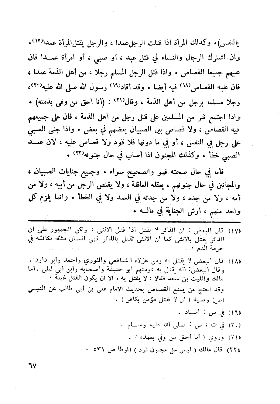 وان اشترك الرجال والنساء في قتل عبد، أو صبي، أو امرأة عمدا فان عليهم جميعا القصاص. واذا قتل الرجل المسلم رجلا، من أهل الذمة عمدا، فان عليه القصاص «18» فيه أيضا. وقد أقاد «19» رسول الله صلى الله عليه «20» ، رجلا مسلما برجل من أهل الذمة، وقال «21» : (أنا أحق من وفى بذمته) .