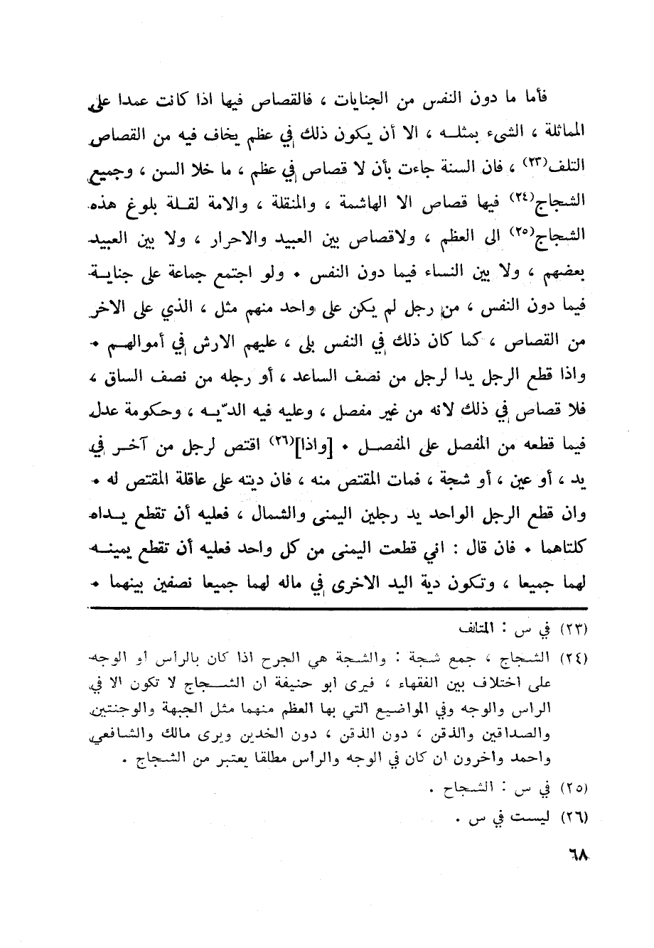 فأما ما دون النفس من الجنايات، فالقصاص فيها اذا كانت عمدا على المماثلة، الشيء بمثله، الا أن يكون ذلك في عظم يخاف فيه من القصاص التلف «23» ، فان السنة جاءت بأن لا قصاص في عظم، ما خلا السن، وجميع الشجاج «24» فيها قصاص الا الهاشمة، والمنقلة، والامة لقلة بلوغ هذه الشجاج «25» الى العظم، ولا قصاص بين العبيد والاحرار، ولا بين العبيد بعضهم، ولا بين النساء فيما دون النفس. ولو اجتمع جماعة على جناية فيما دون النفس، من رجل لم يكن على واحد منهم مثل، الذي على الاخر من القصاص، كما كان ذلك في النفس بلى، عليهم الارش في أموالهم.