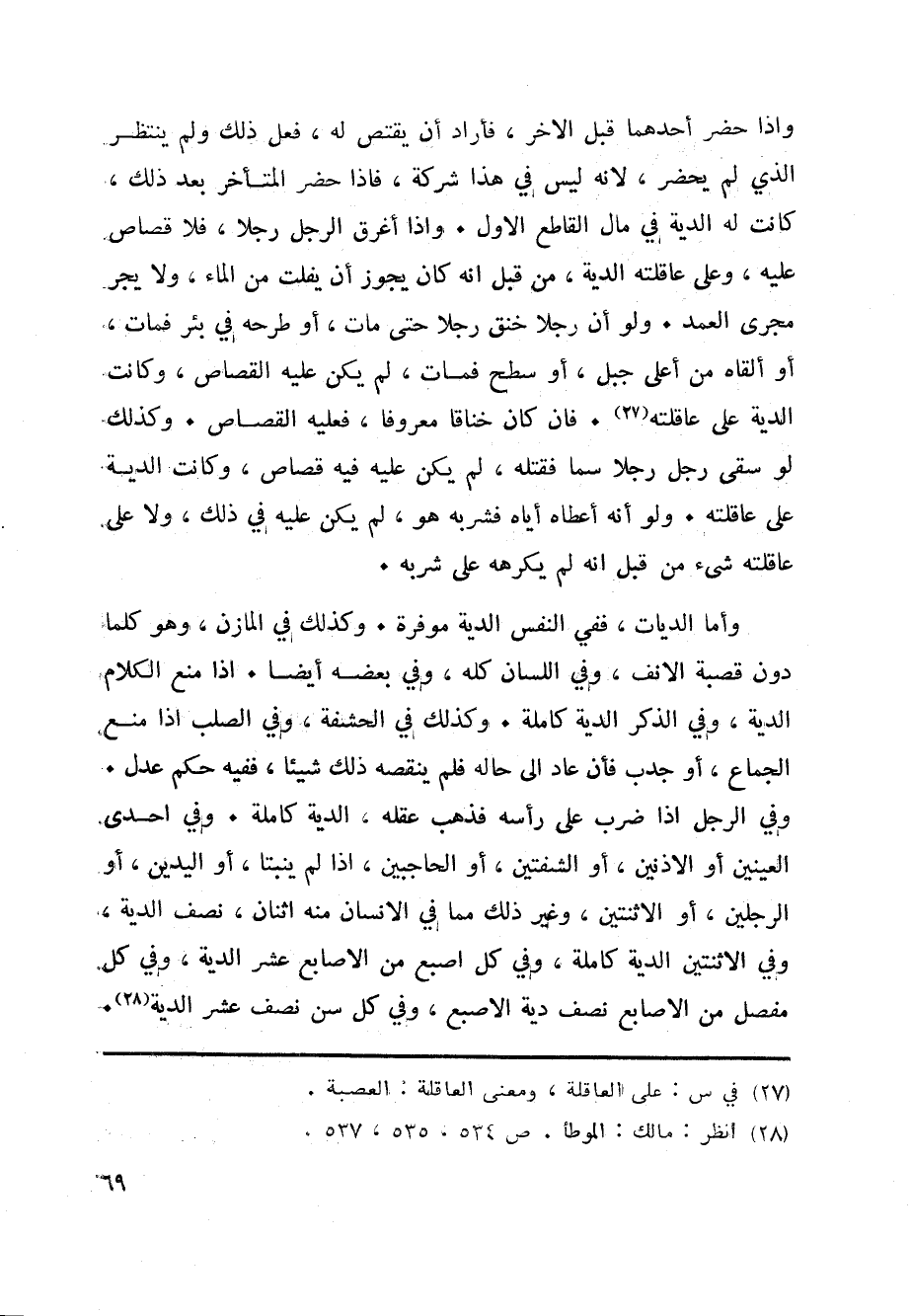 وأما الديات، ففي النفس الدية موفرة. وكذلك في المازن، وهو كلما دون قصبة الانف، وفي اللسان كله، وفي بعضه أيضا. اذا منع الكلام الدية، وفي الذكر الدية كاملة. وكذلك في الحشفة، وفي الصلب اذا منع الجماع، أو جدب فأن عاد الى حاله فلم ينقصه ذلك شيئا، ففيه حكم عدل.