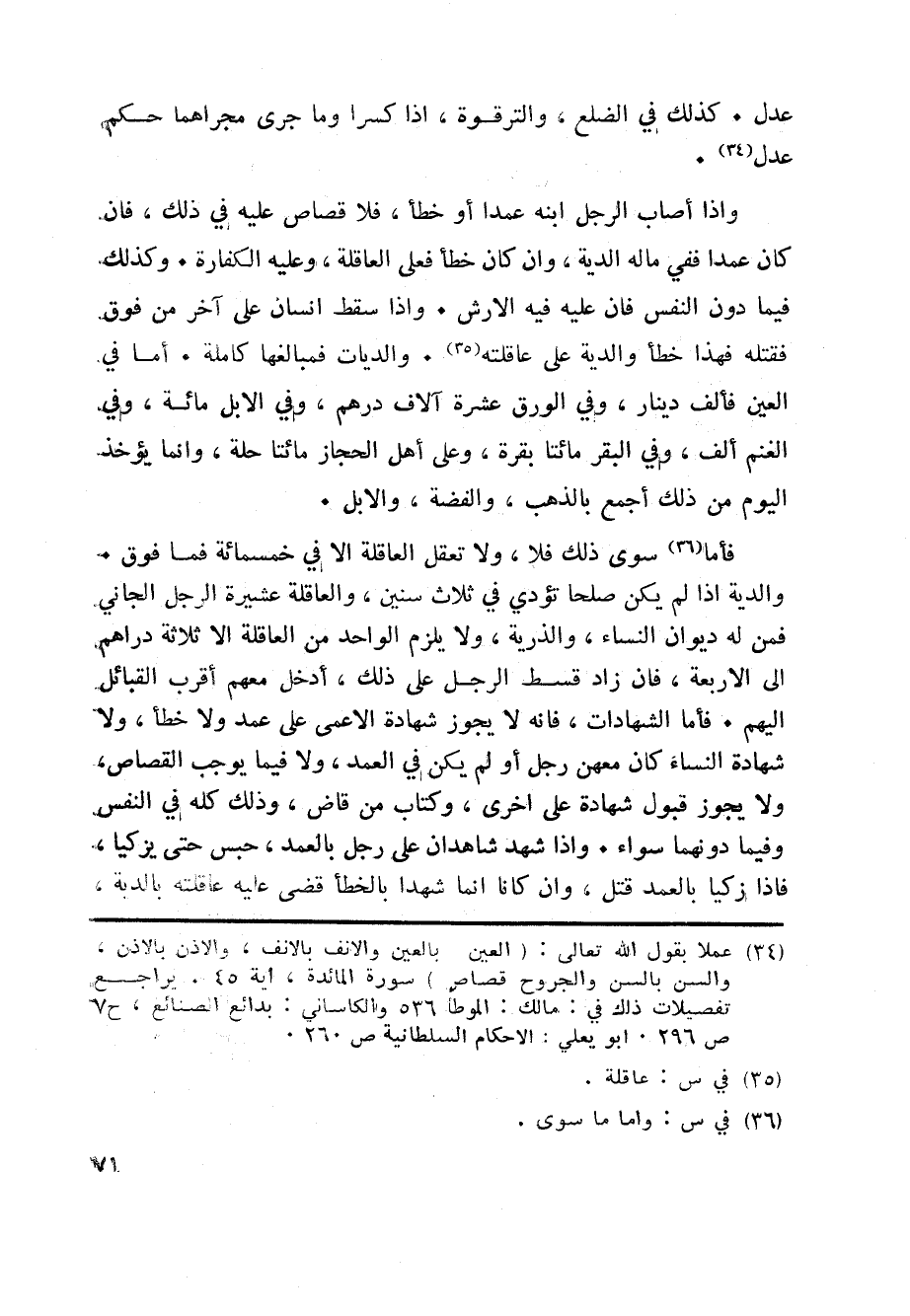 واذا أصاب الرجل ابنه عمدا أو خطأ، فلا قصاص عليه في ذلك، فان كان عمدا ففي ماله الدية، وان كان خطأ فعلى العاقلة، وعليه الكفارة. وكذلك فيما دون النفس فان عليه فيه الارش. واذا سقط انسان على آخر من فوق فقتله فهذا خطأ والدية على عاقلته «35» . والديات فمبالغها كاملة. أما في العين فألف دينار، وفي الورق عشرة آلاف درهم، وفي الابل مائة، وفي الغنم ألف، وفي البقر مائتا بقرة، وعلى أهل الحجاز مائتا حلة، وانما يؤخذ اليوم من ذلك أجمع بالذهب، والفضة، والابل.