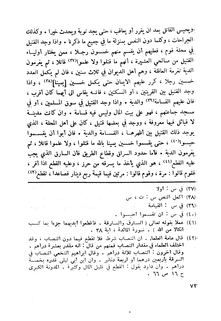 ويحبس القاتل بعد ان يقرر أو يعاقب، حتى يجد توبة ويحدث خيرا. وكذلك الجراحات، وكلما دون النفس بمنزلة ما في جميع ما ذكرنا. واذا وجد القتيل في محلة قوم، فعليهم أن يقسم منهم خمسون رجلا، ممن يختار أولياء القتيل من صالحي العشيرة، أنهم ما قتلوا ولا علموا «37» قاتلا، ثم يغرمون الدية تغرمة العاقلة، وهم أهل الديوان في ثلاث سنين، فان لم يكمل العدد خمسين رجلا، كرر عليهم الايمان حتى يكمل خمسين [يمينا] «38» ، واذا وجد القتيل بين القريتين، أو السكتين، فانه يقاس الى أيهما كان أقرب، فان عليهم القسامة «39» والدية. واذا وجد القتيل في سوق المسلمين، أو في مسجد جماعتهم، فهو على بيت المال وليس فيه قسامة. وان كانت مدينة لا قبائل فيها معروفة، ووجد في بعضها قتيل، كان على أهل المحلة، الذي يوجد ذلك القتيل بين أظهرها، القسامة والدية. فان أبوا أن يقسموا حبسوا «40» ، حتى يقسموا خمسين يمينا بالله ما قتلوا، ولا علموا قاتلا، ثم يغرمون الدية. فأما حدود السراق وقطاع الطريق فأن السارق الذي يجب عليه القطع «41» ، هو الذي يأخذ ما يسرقه من حرز، وعليه القطع اذا أقر، فقوم قالوا: مرة، وقوم قالوا: مرتين فيما قيمة ربع دينار فصاعدا، تقطع «42»