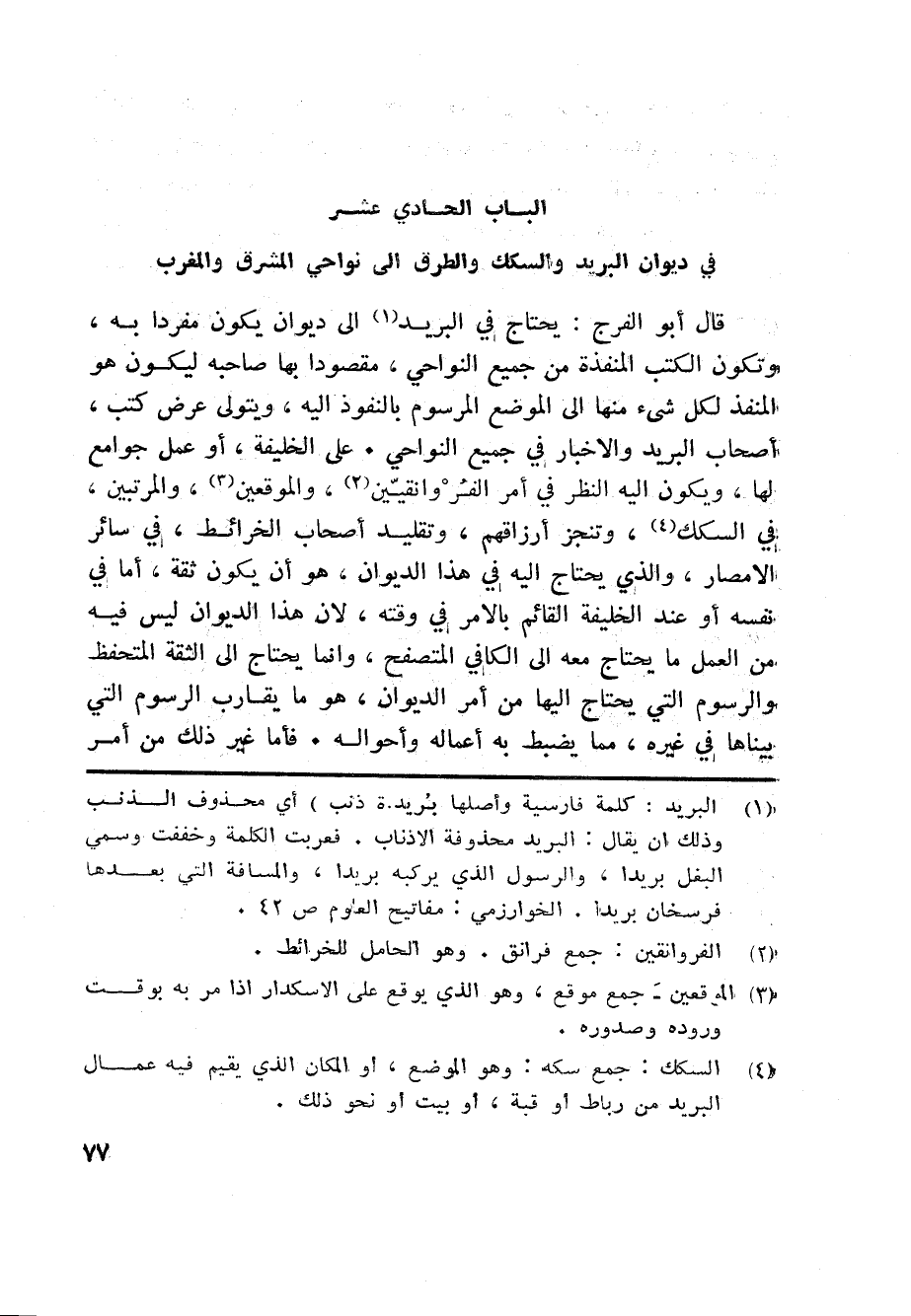 الباب الحادي عشر في ديوان البريد والسكك والطرق الى نواحي المشرق والمغرب
