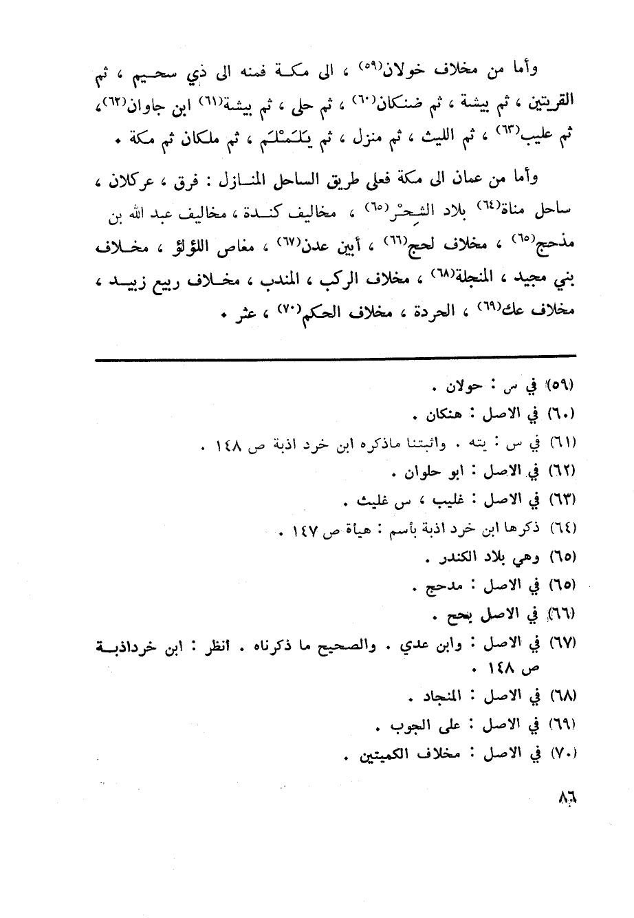 وأما من عمان الى مكة فعلى طريق الساحل المنازل: فرق، عركلان، ساحل مناة «64» بلاد الشحر «65» ، مخاليف كندة، مخاليف عبد الله بن مذحج [في الاصل: مدحج] مخلاف لحج «66» ، أبين عدن «67» ، مغاص اللؤلؤ، مخلاف بني مجيد، المنجلة «68» ، مخلاف الركب، المندب، مخلاف ربيع زبيد، مخلاف عك «69» ، الحردة، مخلاف الحكم «70» ، عثر.