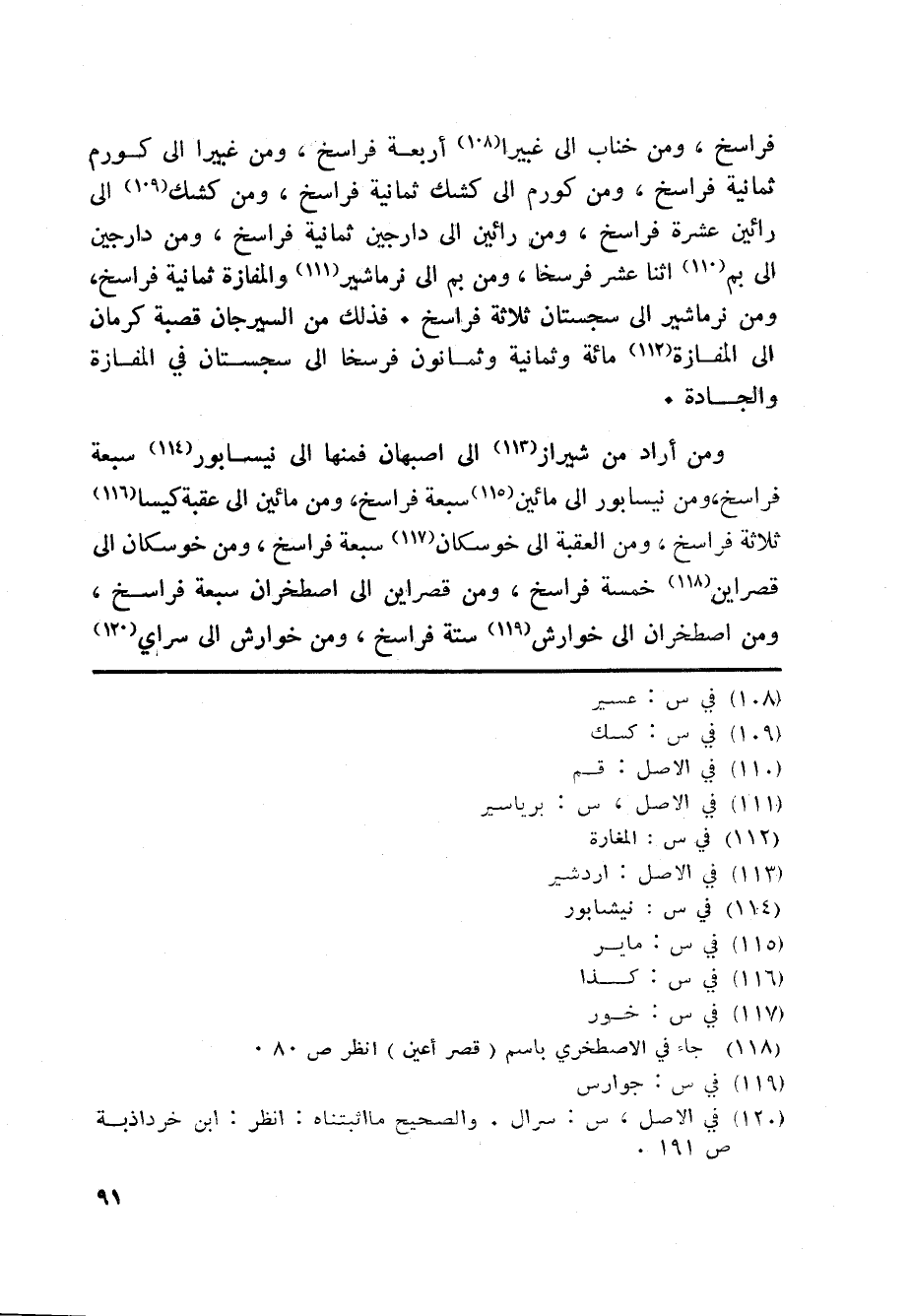 ومن أراد من شيراز «113» الى اصبهان فمنها الى نيسابور «114» سبعة فراسخ، ومن نيسابور الى مائين «115» سبعة فراسخ، ومن مائين الى عقبة كيسا «116» ثلاثة فراسخ، ومن العقبة الى خوسكان «117» سبعة فراسخ، ومن خوسكان الى قصراين «118» خمسة فراسخ، ومن قصراين الى اصطخران سبعة فراسخ، ومن اصطخران الى خوارش «119» ستة فراسخ، ومن خوارش الى سراي «120»