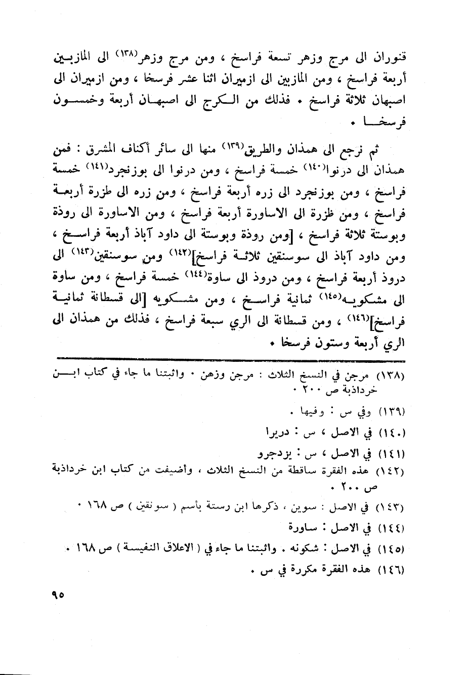ثم نرجع الى همذان والطريق «139» منها الى سائر أكناف المشرق: فمن همذان الى درنوا «140» خمسة فراسخ، ومن درنوا الى بوزنجرد «141» خمسة فراسخ، ومن بوزنجرد الى زره أربعة فراسخ، ومن زره الى طزرة أربعة فراسخ، ومن ظزرة الى الاساورة أربعة فراسخ، ومن الاساورة الى روذة وبوستة ثلاثة فراسخ، [ومن روذة وبوستة الى داودآباذ أربعة فراسخ، ومن داودآباذ الى سوسنقين ثلاثة فراسخ] «142» ومن سوسنقين «143» الى دروذ أربعة فراسخ، ومن دروذ الى ساوة «144» خمسة فراسخ، ومن ساوة الى مشكويه «145» ثمانية فراسخ، ومن مشكويه [الى قسطانة ثمانية فراسخ] «146» ، ومن قسطانة الى الري سبعة فراسخ، فذلك من همذان الى الري أربعة وستون فرسخا.