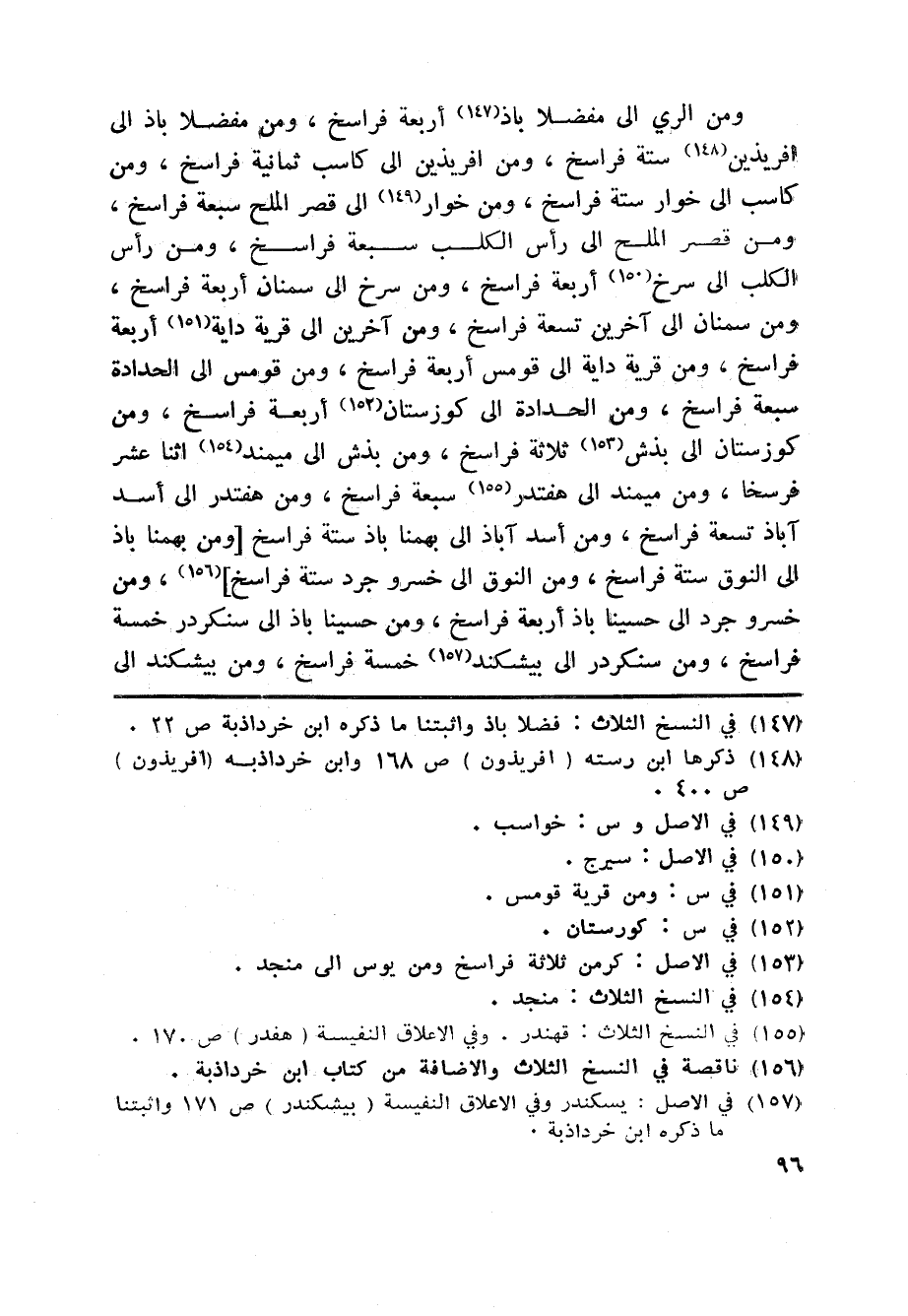 ومن الري الى مفضلا باذ «147» أربعة فراسخ، ومن مفضلا باذ الى افريذين «148» ستة فراسخ، ومن افريذين الى كاسب ثمانية فراسخ، ومن كاسب الى خوار ستة فراسخ، ومن خوار «149» الى قصر الملح سبعة فراسخ، ومن قصر الملح الى رأس الكلب سبعة فراسخ، ومن رأس الكلب الى سرخ «150» أربعة فراسخ، ومن سرخ الى سمنان أربعة فراسخ، ومن سمنان الى آخرين تسعة فراسخ، ومن آخرين الى قرية داية «151» أربعة فراسخ، ومن قرية داية الى قومس أربعة فراسخ، ومن قومس الى الحدادة سبعة فراسخ، ومن الحدادة الى كوزستان «152» أربعة فراسخ، ومن كوزستان الى بذش «153» ثلاثة فراسخ، ومن بذش الى ميمند «154» اثنا عشر فرسخا، ومن ميمند الى هفتدر «155» سبعة فراسخ، ومن هفتدر الى أسدآباذ تسعة فراسخ، ومن أسدآباذ الى بهمنا باذ ستة فراسخ [ومن بهمنا باذ الى النوق ستة فراسخ، ومن النوق الى خسرو جرد ستة فراسخ] «156» ، ومن خسرو جرد الى حسينا باذ أربعة فراسخ، ومن حسينا باذ الى سنكردر خمسة فراسخ، ومن سنكردر الى بيشكند «157» خمسة فراسخ، ومن بيشكند الى