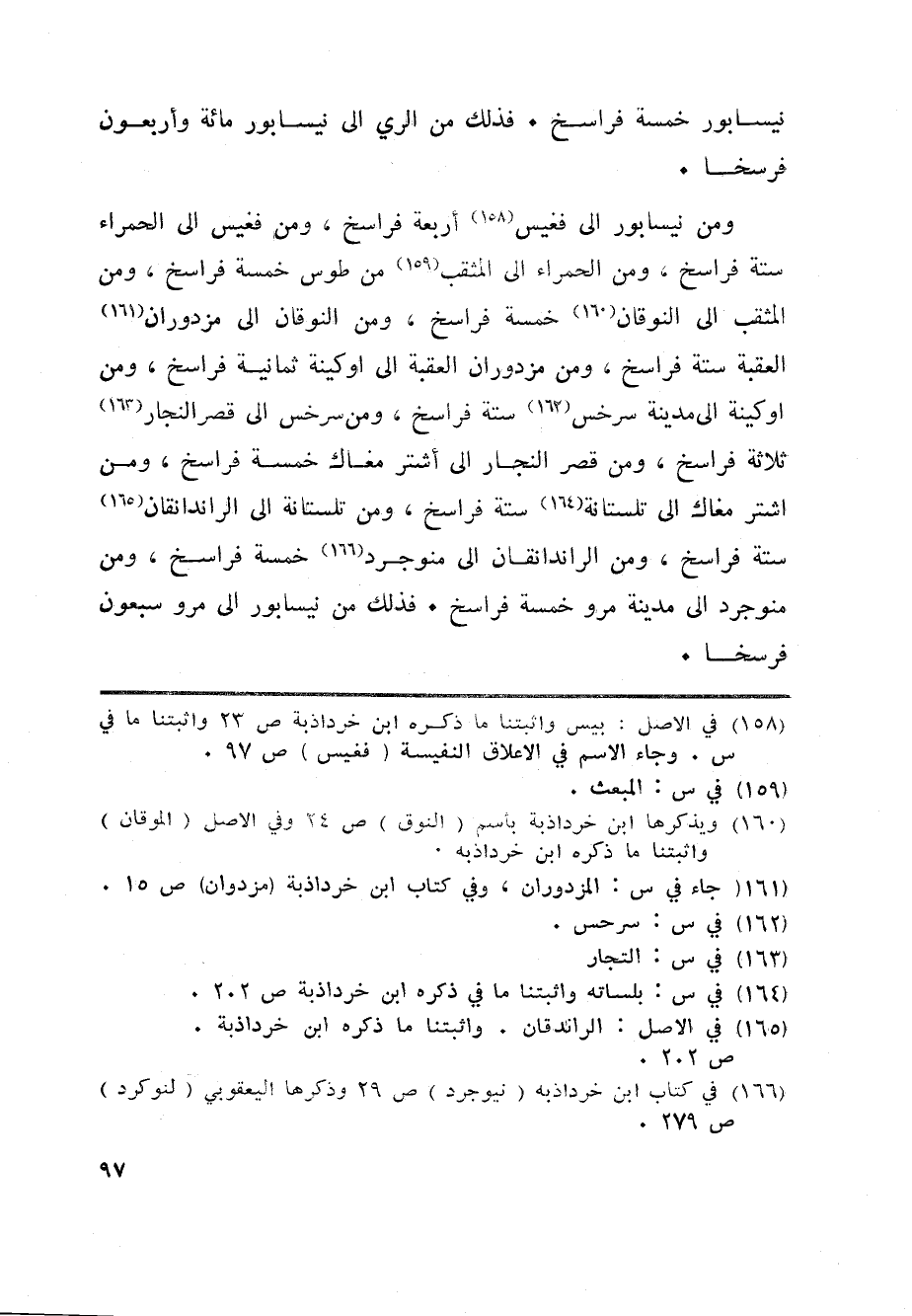 ومن نيسابور الى فغيس «158» أربعة فراسخ، ومن فغيس الى الحمراء ستة فراسخ، ومن الحمراء الى المثقب «159» من طوس خمسة فراسخ، ومن المثقب الى النوقان «160» خمسة فراسخ، ومن النوقان الى مزدوران «161» العقبة ستة فراسخ، ومن مزدوران العقبة الى اوكينة ثمانية فراسخ، ومن اوكينة الى مدينة سرخس «162» ستة فراسخ، ومن سرخس الى قصر النجار «163» ثلاثة فراسخ، ومن قصر النجار الى أشتر مغاك خمسة فراسخ، ومن اشتر مغاك الى تلستانة «164» ستة فراسخ، ومن تلستانة الى الراندانقان «165» ستة فراسخ، ومن الراندانقان الى منوجرد «166» خمسة فراسخ، ومن منوجرد الى مدينة مرو خمسة فراسخ. فذلك من نيسابور الى مرو سبعون فرسخا.
