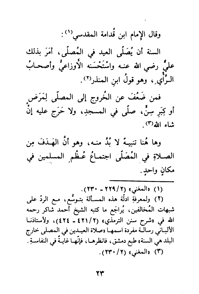 (2) ولمعرفةِ أدلّة هذه المسالة بتوسُّع، مع الردّ على شبهات المُخالفين، يُراجَع ما كتبه الشيخ أحمد شاكر رحمه الله في "شرح سنن الترمذي" (2/421- 424) ، ولأستاذنا الألباني رسالة مفردة اسمها "صلاة العيدين في المصلى خارج البلد هي السنة" طبع دمشق، فانظرها، فإنّها غايةٌ في النفاسةِ.