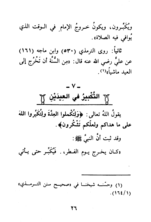 ثانياً: روى الترمذي (530) وابن ماجه (161) عن عليٍّ رضي الله عنه قال: "مِن السُّنَّة أن تَخْرُج إلى العيد ماشياً" (1) .