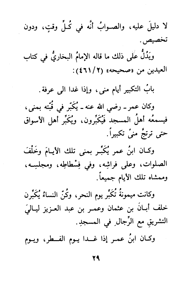 وكان ابنُ عمر يُكَبِّر بمنى تلك الأيامَ وخَلْفَ الصلوات، وعلى فراشِه، وفي فِسْطاطِه، ومجلسِه، وممشاه تلك الأيام جميعاً.