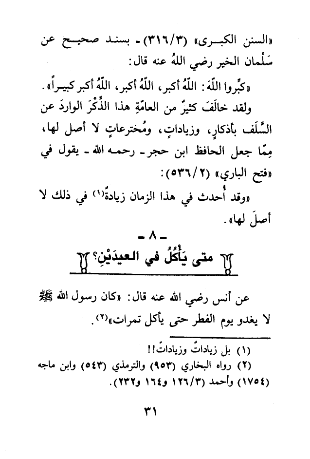 عن أنس رضي اللُه عنه قال: "كان رسول الله - صلى الله عليه وسلم - لا يغدو يوم الفطر حتى يأكل تمرات" (2) .