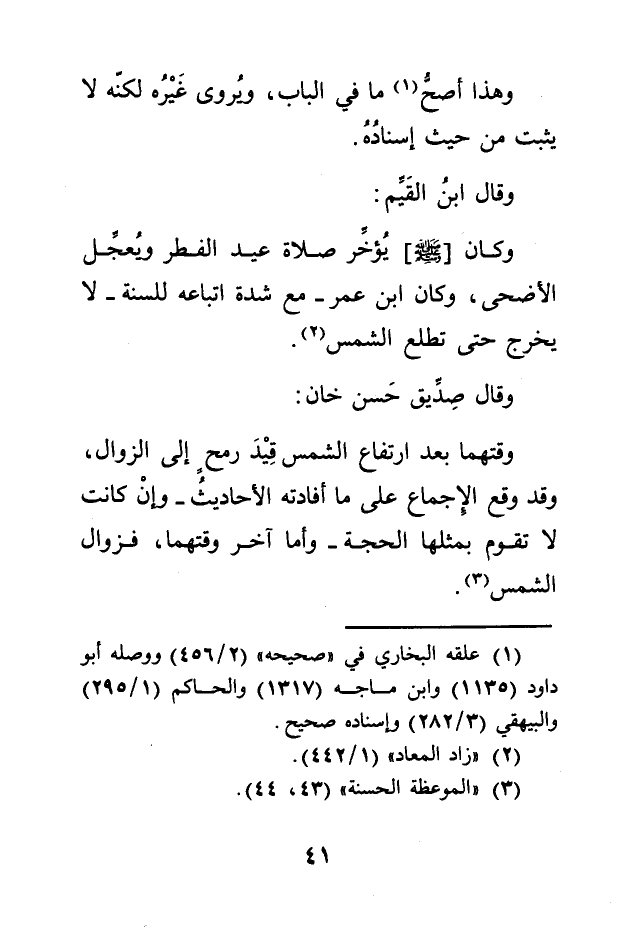وكان [صلى الله عليه وسلم] ، يُؤخِّر صلاة عيد الفطر ويُعجِّل الأضحى، وكان ابن عمر- مع شدة اتباعه للسنة- لا يخرج حتى تطلع الشمس (2) .