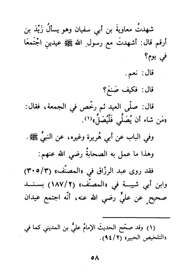 شهدتُ معاويةَ بن أبي سفيان وهو يسألى زَيْدَ بن أرقم قال: أشهدتَ مع رسولِ الله - صلى الله عليه وسلم - عيدينِ اجْتَمعَا في يوم؟