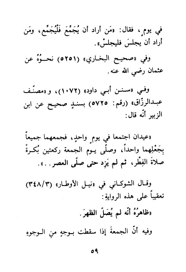 "عيدان اجتمعا في يوم واحدٍ، فجمعهما جميعاً بِجَعْلِهما واحداً، وصلّى يوم الجمعة ركعتين بُكرةً صلاةَ الفِطْر، ثم لم يَزِد حتى صلّى العصر.. ".