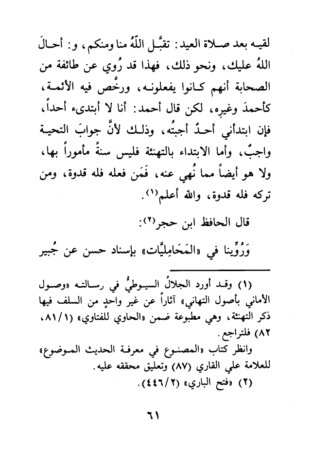 لقيه بعد صلاة العيد: تقبّل اللهُ منا ومنكم، و: أحالَ اللهُ عليك، ونحو ذلك، فهذا قد رُوي عن طائفة من الصحابة أنهم كانوا يفعلونه، ورخَّص فيه الأئمة، كأحمدَ وغيرِه، لكن قال أحمد: أنا لا أبتدىء أحداً، فإن ابتدأني أحدٌ أجبتُه، وذلك لأنّ جوابَ التحية واجبٌ، وأما الابتداء بالتهنئة فليس سنة مأموراً بها، ولا هو أيضاً مما نُهي عنه، فَمَن فعله فله قدوة، ومن تركه فله قدوة، والله أعلم (1) .