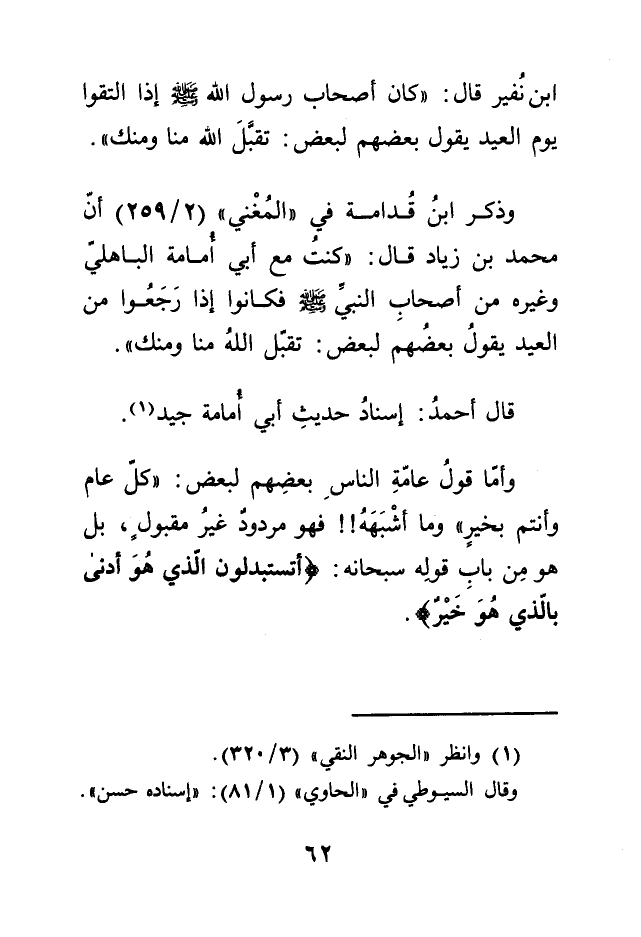 ابن نُفير قال: "كان أصحاب رسول الله - صلى الله عليه وسلم - إذا التقوا يوم العيد يقول بعضهم لبعض: تقبّلَ الله منا ومنك ".