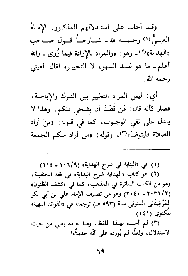 وقد أجاب على استدلالهم المذكور، الإمامُ العينيّ (1) رحمه الله- شارحاً قولَ صاحب "الهداية" (2) - وهو: "والمراد بالِإرادة فيما رُوي- والله أعلم- ما هو ضد السهو، لا التخيير" فقال العيني رحمه الله: