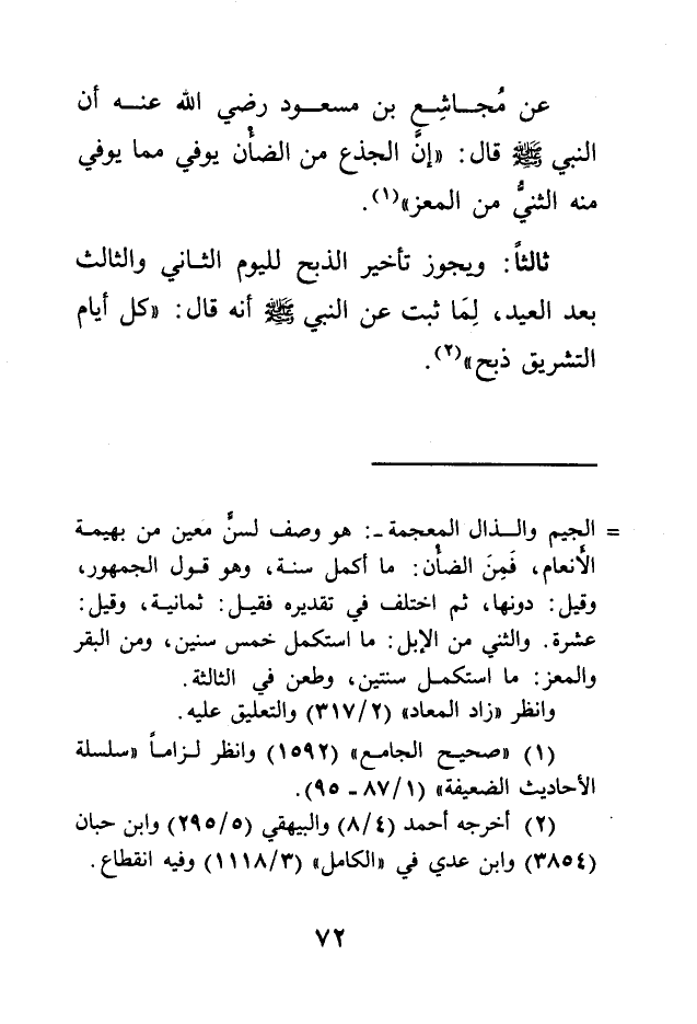 عن مُجاشِع بن مسعود رضي الله عنه أن النبي - صلى الله عليه وسلم - قال: "إنَّ الجذع من الضأن يوفي مما يوفي منه الثنيّ من المعز" (1) .