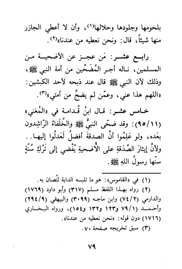 خامس عشر: قال ابن قدامة في "المغني " (11/95) : وقد ضحّى النبي - صلى الله عليه وسلم - والخُلَفاء الرّاشِدون بعَده، ولو عَلِمُوا أنَّ الصدقةَ أفضلُ لَعَدلُوا إليها.. ولأنّ إيثارَ الصَدَقةِ على الأضحيةِ يُفْضي إلى تَرْكِ سنّةٍ سنَّها رسولُ اللهِ - صلى الله عليه وسلم -.