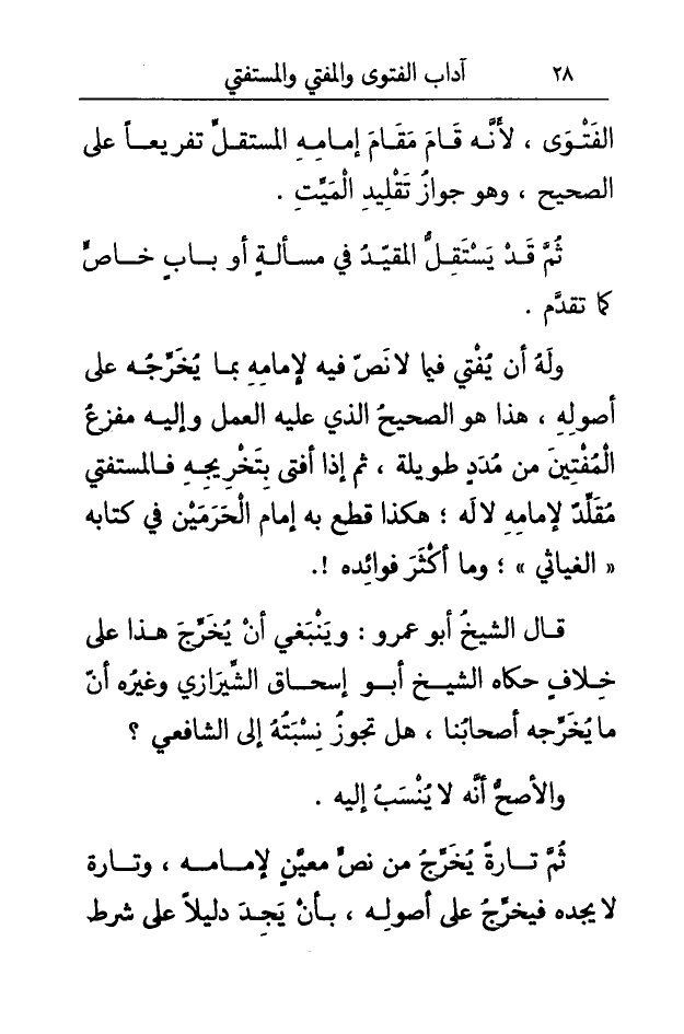 وَله أَن يُفْتِي فِيمَا لَا نصَّ فِيهِ لإمامه بِمَا يُخرجهُ على أُصُوله هَذَا هُوَ الصَّحِيح الَّذِي عَلَيْهِ الْعَمَل وَإِلَيْهِ مفزع الْمُفْتِينَ من مُدَدٍ طَوِيلَة ثمَّ إِذا أفتى بتخريجه فالمستفتي مقلد لإمامه لَا لَهُ هَكَذَا قطع بِهِ إِمَام الْحَرَمَيْنِ فِي كِتَابه الغياثي وَمَا أَكثر فَوَائده