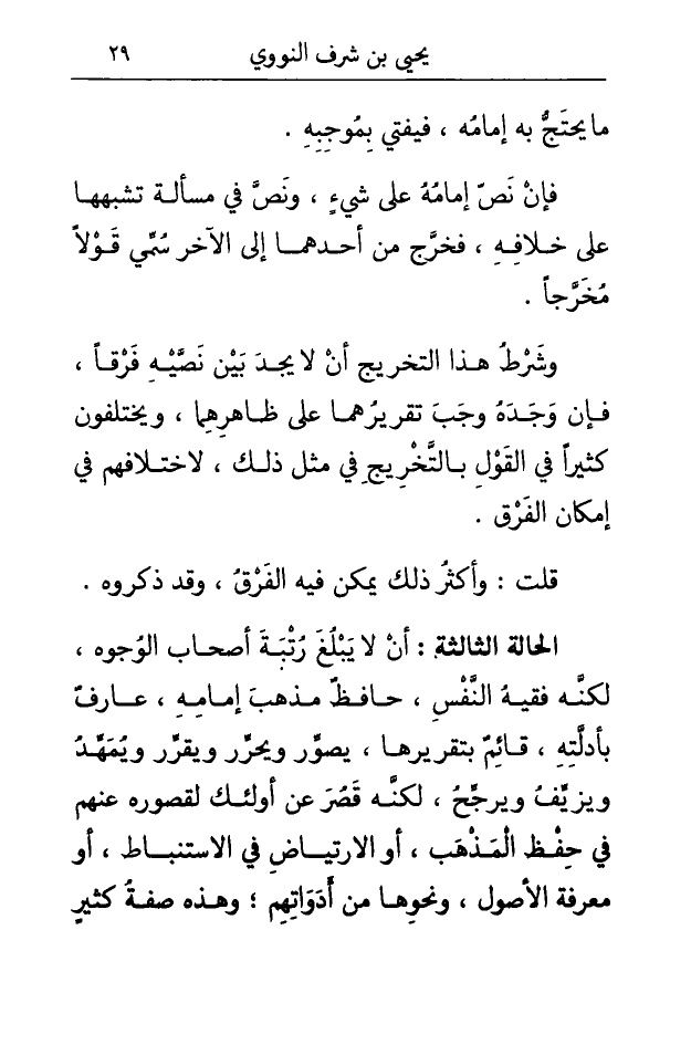 الْحَالة الثَّالِثَة أَن لَا يبلغ رُتْبَة أَصْحَاب الْوُجُوه لكنه فَقِيه النَّفس حَافظ مَذْهَب إِمَامه عَارِف بأدلته قَائِم بتقريرها يصوّر ويحرّر ويقرّر ويمهد ويزيف ويرجح لكنَّه قصر عَن أُولَئِكَ لقصوره عَنْهُم فِي حفظ الْمَذْهَب أَو الارتياض فِي الاستنباط أَو معرفَة الْأُصُول وَنَحْوهَا من أدواتهم وَهَذِه صفةُ كثيرٍ
