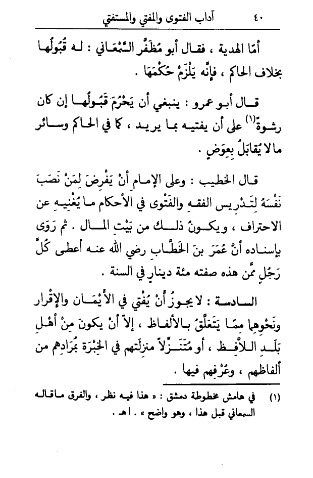 قَالَ الْخَطِيب وعَلى الإِمَام أَن يفْرض لمن نصب نَفسه لتدريس الْفِقْه وَالْفَتْوَى فِي الْأَحْكَام مَا يُغْنِيه عَن الاحتراف وَيكون ذَلِك من بَيت المَال ثمَّ روى بِإِسْنَادِهِ أَن عمر بن الْخطاب رَضِي الله عَنهُ أعْطى كلَّ رجلٍ مِمَّن هَذِه صفته مئة دِينَار فِي السّنة