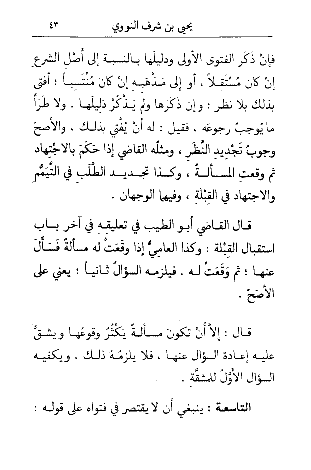 التَّاسِعَة يَنْبَغِي أَن لايقتصر فِي فتواه على قَوْله