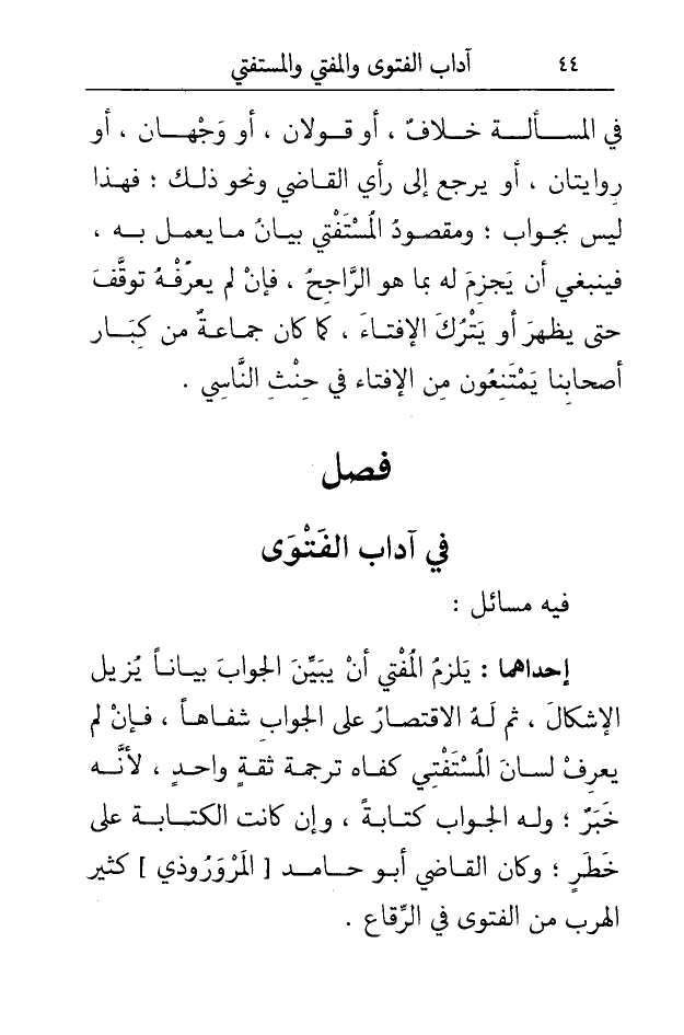 فِي الْمَسْأَلَة خلاف أَو قَولَانِ أَو وَجْهَان أَو رِوَايَتَانِ أَو يرجع إِلَى رَأْي القَاضِي وَنَحْو ذَلِك فَهَذَا لَيْسَ بِجَوَاب ومقصود المستفتي بَيَان مَا يعْمل بِهِ فَيَنْبَغِي أَن يجْزم لَهُ بِمَا هُوَ الرَّاجِح فَإِن لم يعرفهُ توقَّف حَتَّى يظْهر أَو يتْرك الْإِفْتَاء كَمَا كَانَ جمَاعَة من كبار أَصْحَابنَا يمتنعون من الْإِفْتَاء فِي حنث النَّاسِي