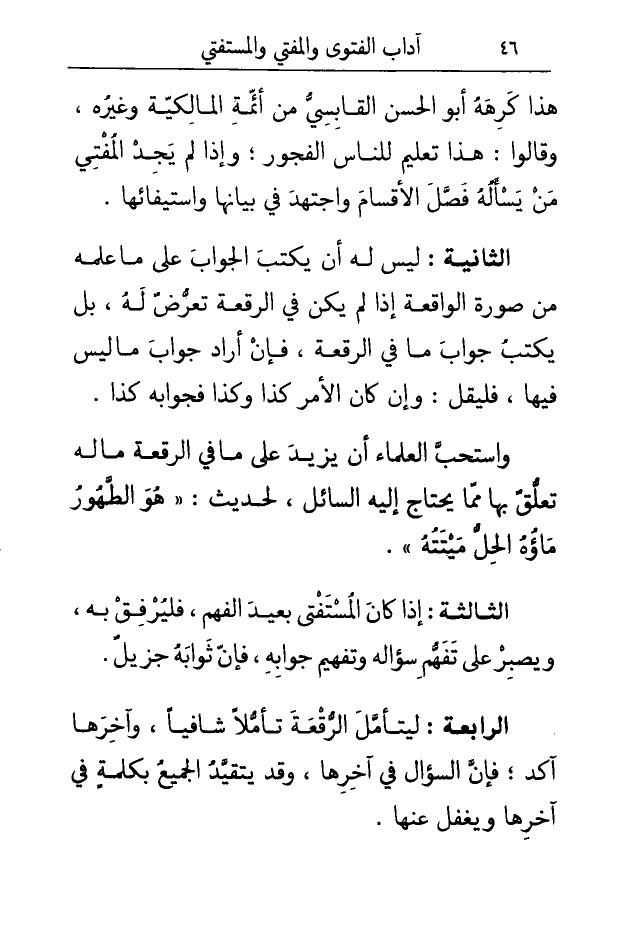 الثَّالِثَة إِذا كَانَ المستفتي بعيد الْفَهم فليرفقْ بِهِ ويصبر على تفهم سُؤَاله وتفهيم جَوَابه فَإِن ثَوَابه جزيل
