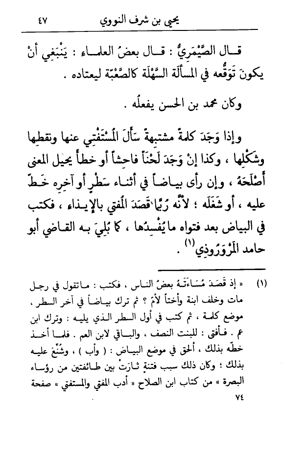 وَإِذا وجد كلمة مشتبهة سَأَلَ المستفتي عَنْهَا ونقَّطها وشكلها وَكَذَا إِن وجد لحناً فَاحِشا أَو خطأ يحِيل الْمَعْنى أصلحه وَإِن رأى بَيَاضًا فِي أثْنَاء سطر أَو آخِره خطّ عَلَيْهِ أَو شغله لأنَّه رُبمَا قَصَد الْمُفْتى بالإيذاء فَكتب فِي الْبيَاض بعد فتواه مَا يُفْسِدهَا كَمَا بلي بِهِ القَاضِي أَبُو حَامِد المروروذي